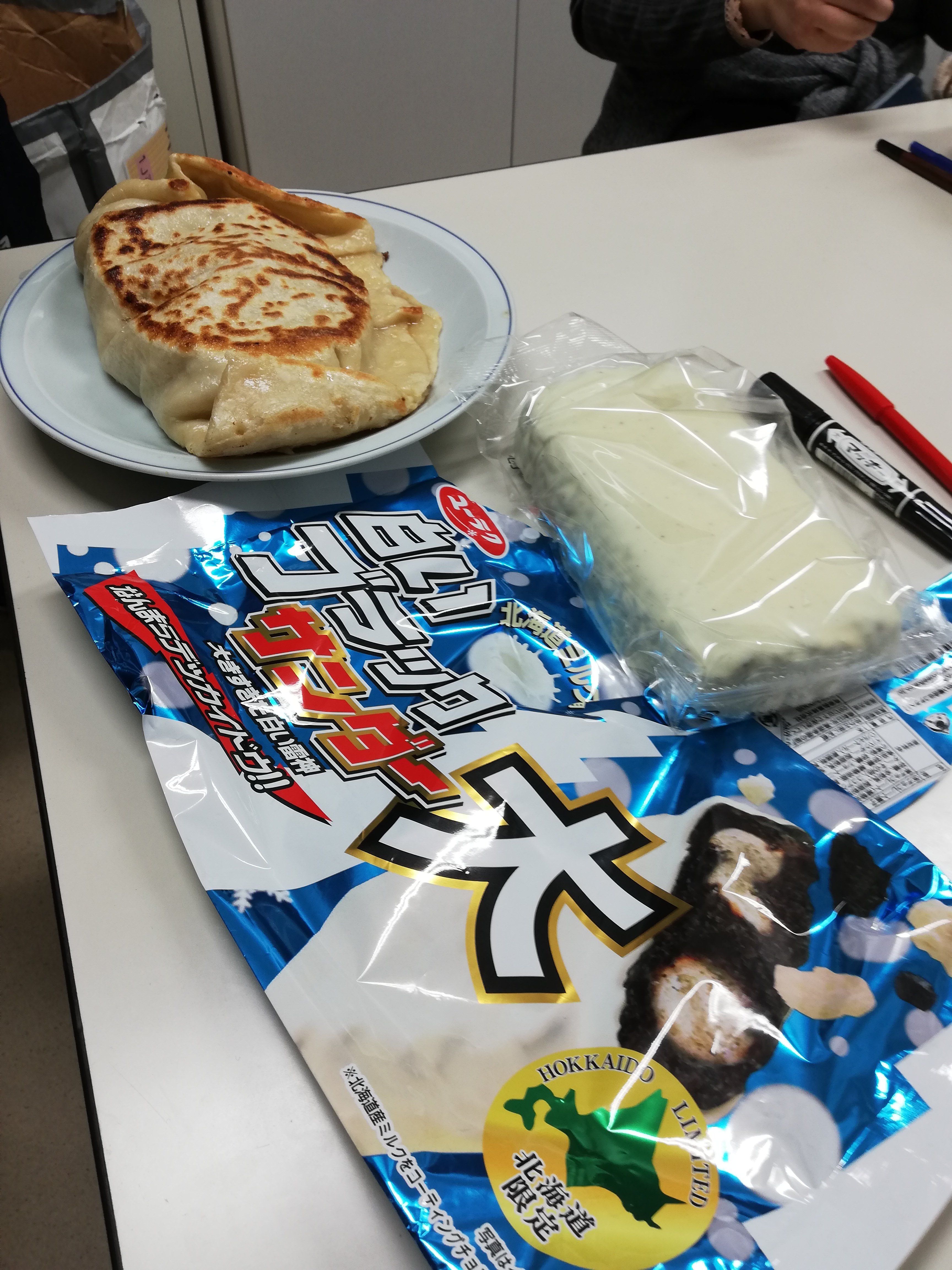 杉山淳一さんの差し入れ・巨大な白いブラックサンダーと会長の巨大餃子の対決もありました。巨大餃子は生焼けになりやすいので長時間蒸します!そのうえで焼きます!最後には切り分けたブラックサンダーのコナも皮に包まれて、めっちゃ器用な包みキングこと酋長のデザートギョーザと並ぶ甘いヤツになったり。