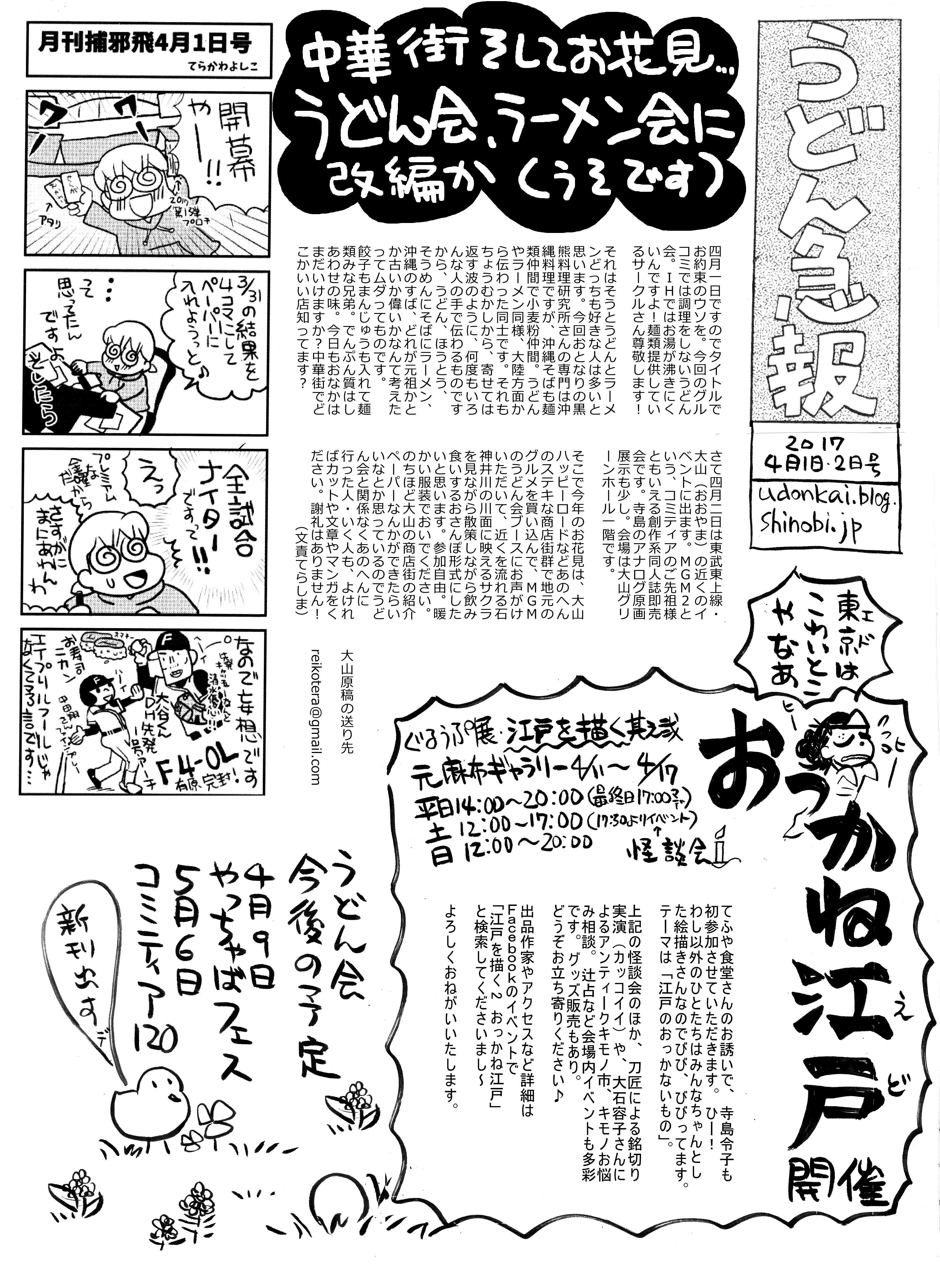 ところでこの週末はイベント続きで花見の日程がとれなかったうどん会は、この日開場ちかくの石神井川の桜で恒例の花見を行うことに。大山駅から会場まで、またその周辺には商店街が多いので、そこで買い食い的なカンジで三々五々来た人順に、イベントの店番と交代しながら…というゆるい設定。