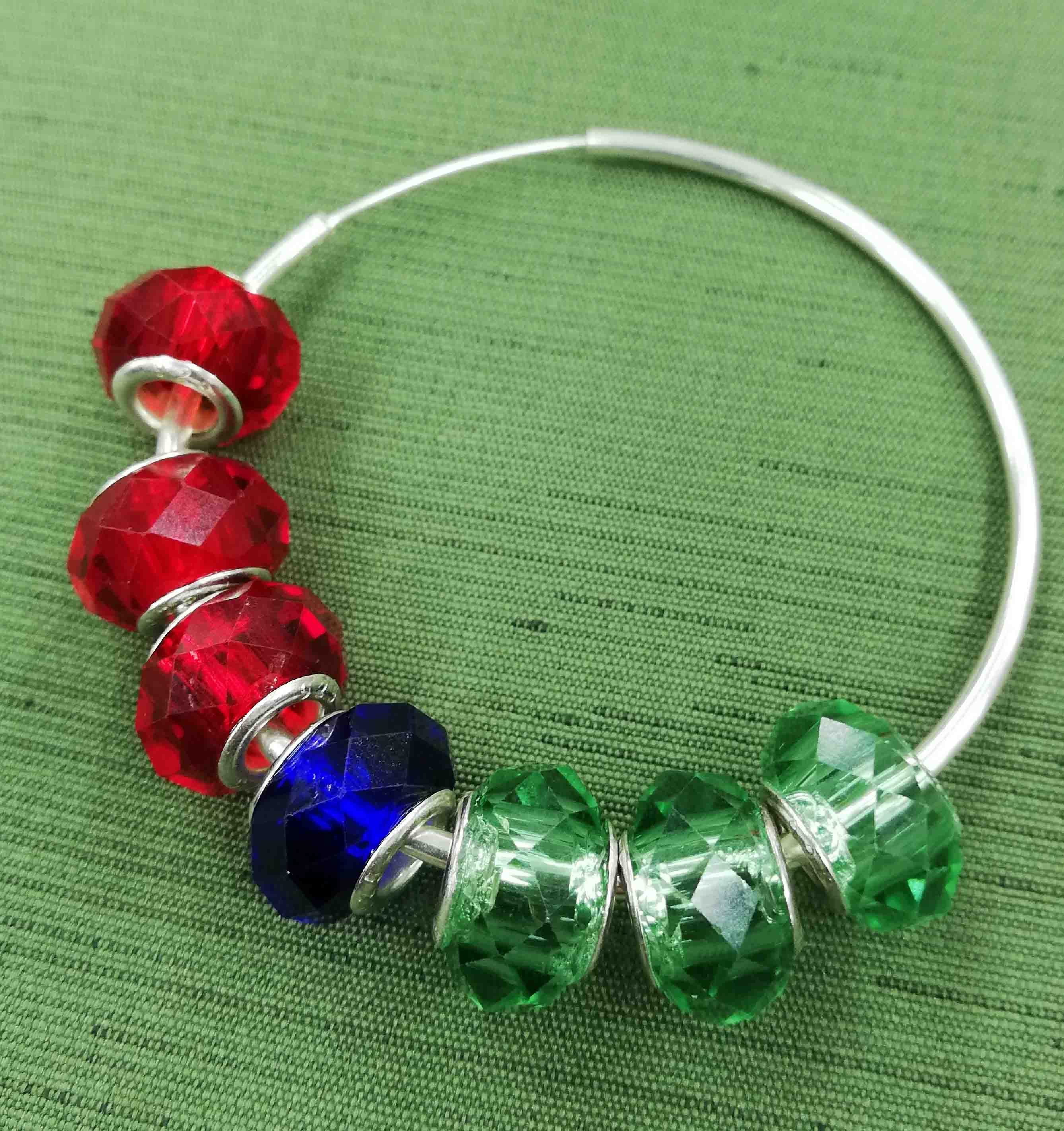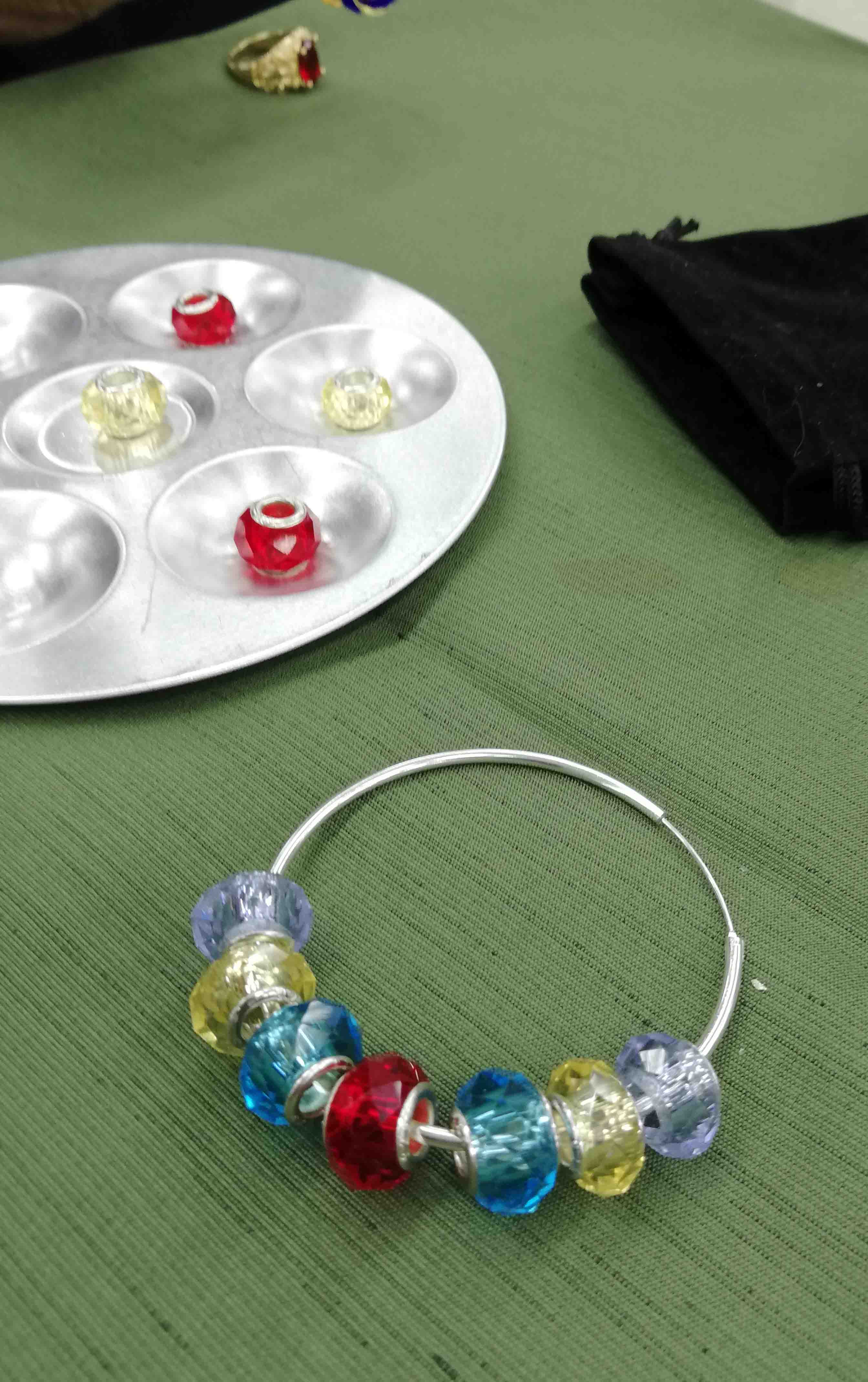 スタートプレイヤーになったわし、袋からランダムにとりだしたビーズを輪に通し、閉じて回して…ろんでる!天和、イッパツで3色の線対称ができてアガリです。わーい!