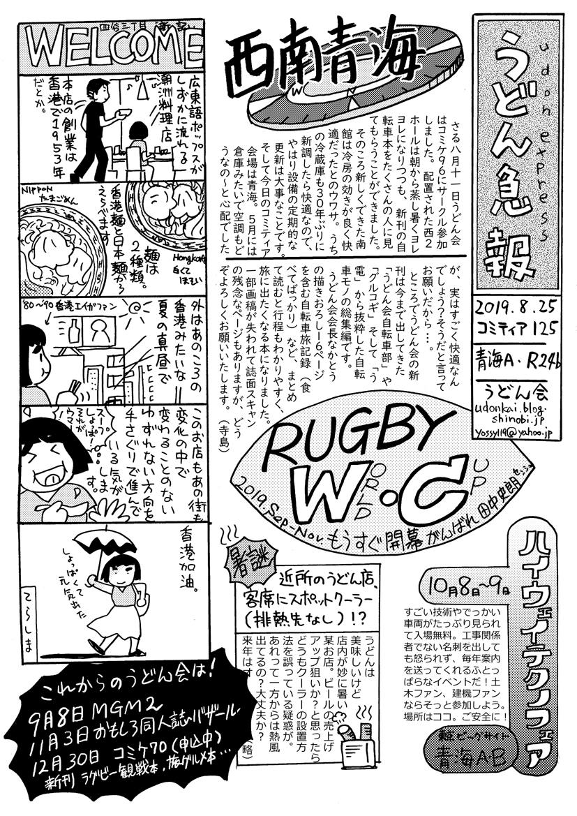 うどん会がコミケでは飲食を扱う評論ジャンルなのに本拠地(と、自分では思っている)コミティアではかたくなにその他ジャンルなのは、ようするにエッセイ漫画や4コマといったスキマに入りがちな発信のスタイルがこよなく好きで、たまたま題材が飲食になりがちなだけだからです。その他にはとてもいろんな本が集まっていて楽しいし、今回はうちも自転車本の総集編ですしね!あとで評論の仲間たちにもペーパーもっていこうっと。と思ったら、玉置さんの本来の目的地はうちではなく一個となりの「ポン豆や」さんでした。なあんだ。