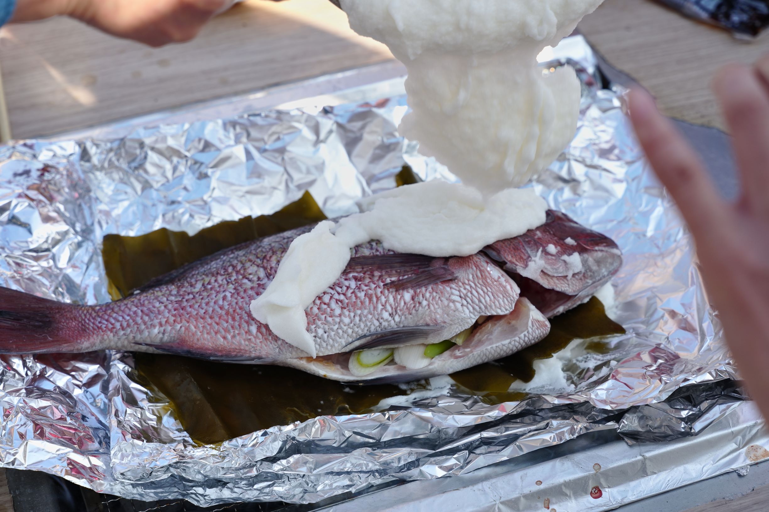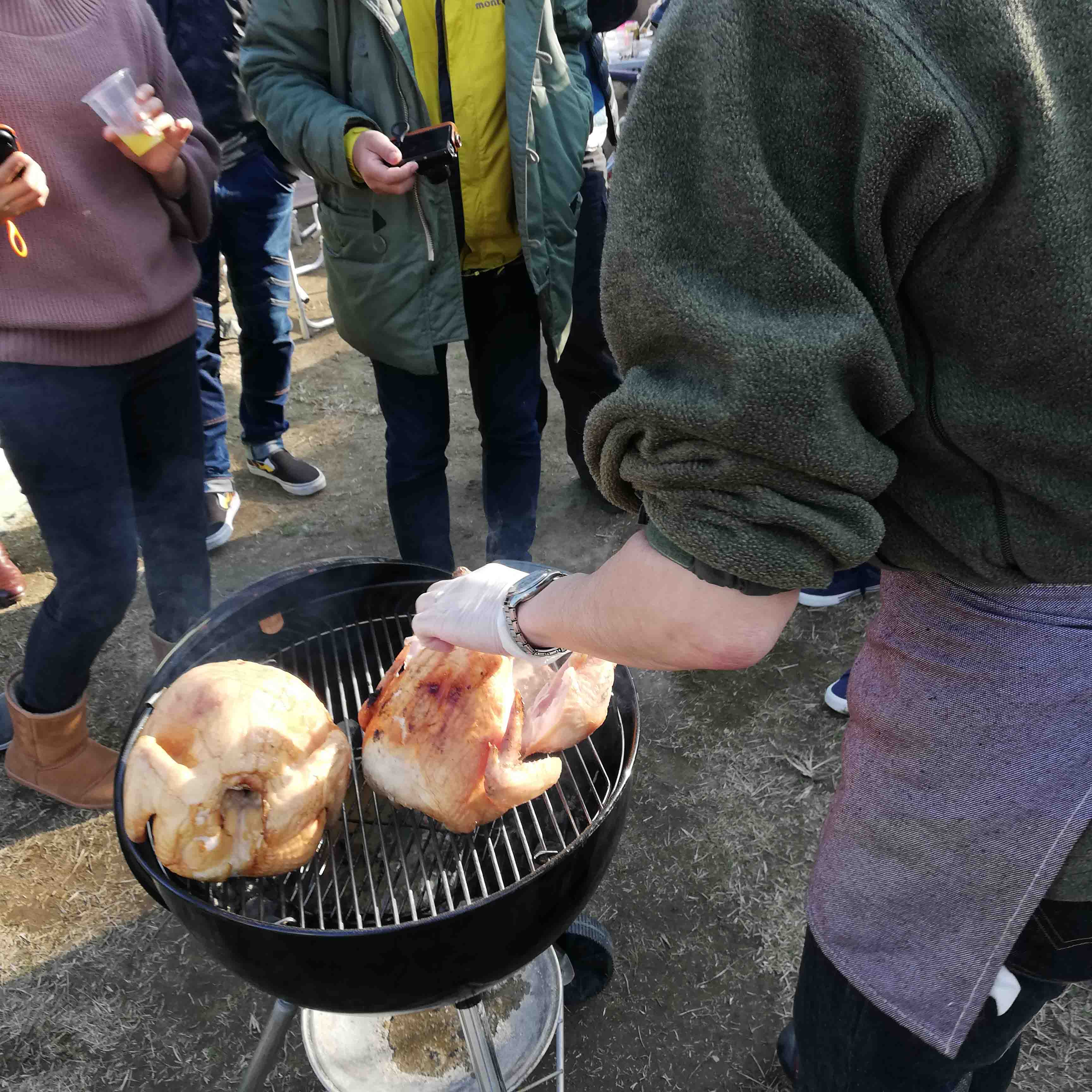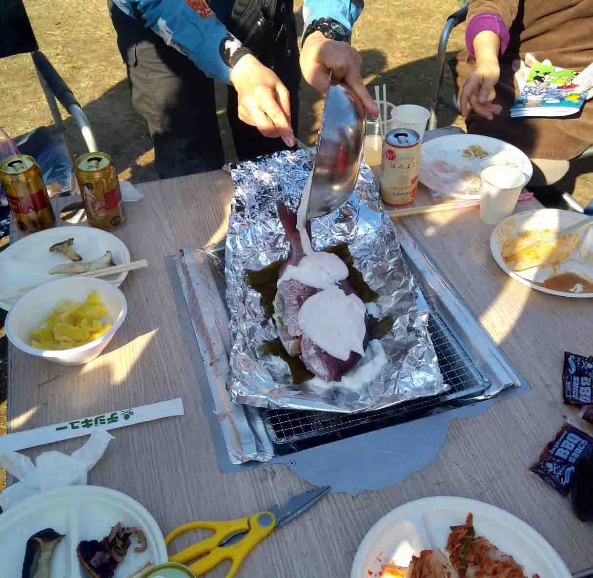 ビアカンチキンは事前申告で持ち込んだふたつきBBQコンロで2羽同時進行です。”イングレスBBQ”からゲストのにしだやさんいつもありがとう!でっかくて超旨い鯛の塩釜焼はゲストの横川俊さん。アツアツきのこのアヒージョと旨味たっぷり豚塊肉はゲストの麻生あいみちゃん。大好評インドネシアの緑豆のお汁粉はゲストの吉田肉子てぃやん。フグひれ酒もゲストのしごとで黒熊ボンボンさん。チーズタッカルビはうどん会田中としひさ、バックリブのレモン漬けやレモンソースなどレモン仕事はてらしま(レモンといっしょに手を切りました…)。そのほかソーセージ・餅・マシュマロ・キムチ・たくあん・焼き芋等持ち込みの品々…グリューワイン…、美味しいものがいっぱいあって、お天気にも恵まれて最高の野外の一日でした♪