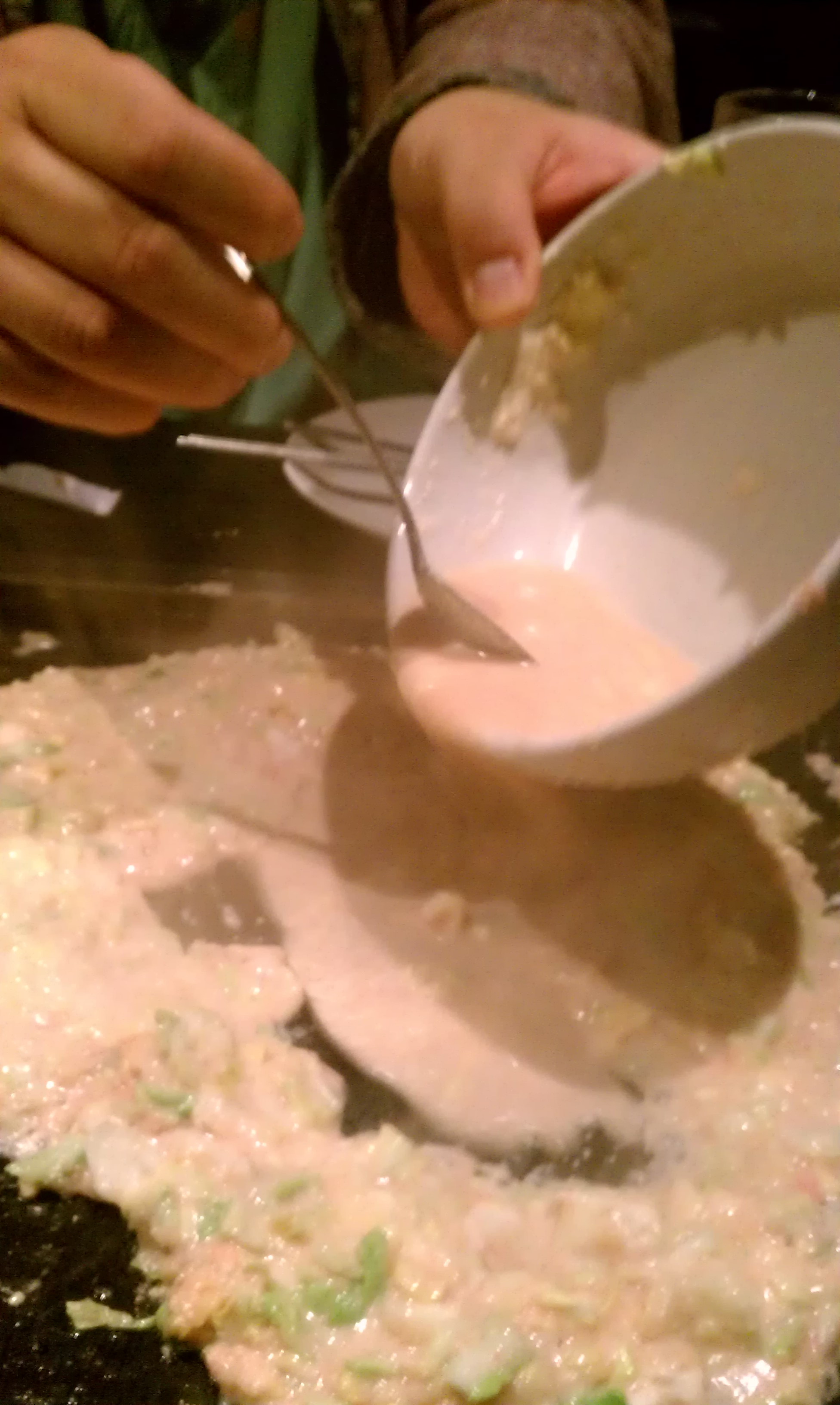 下町っこ たまひよさんが焼き方指南。まず具だけを油を引いた鉄板にオン