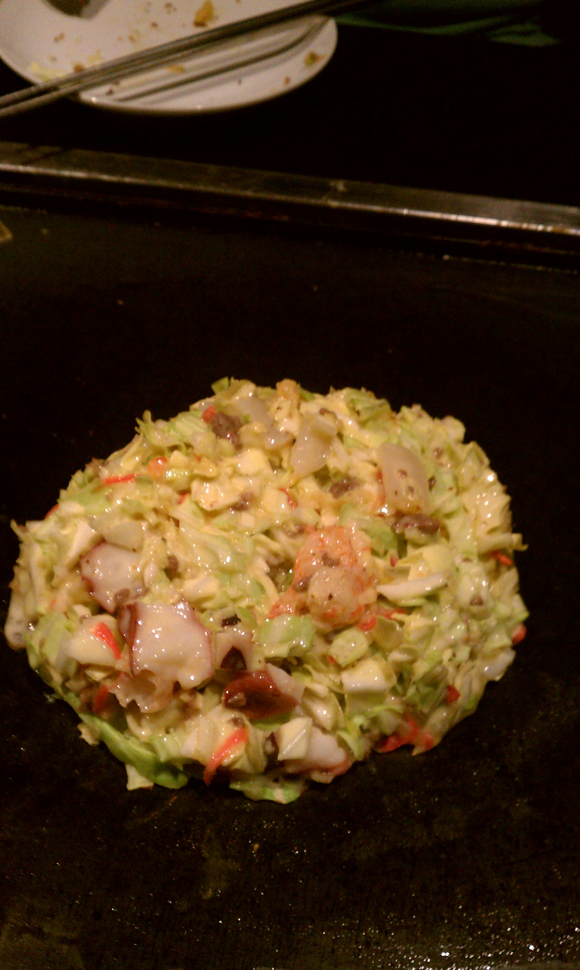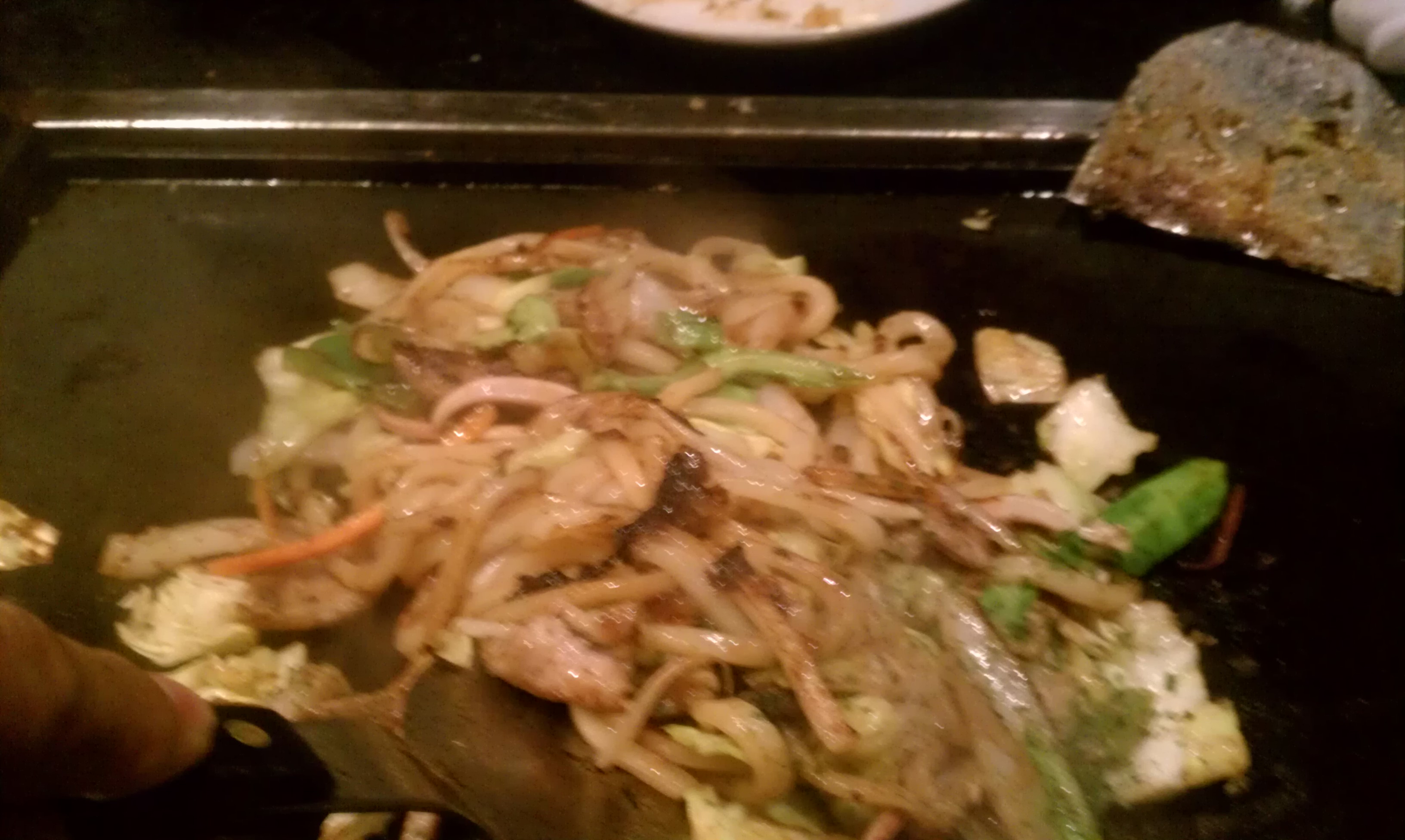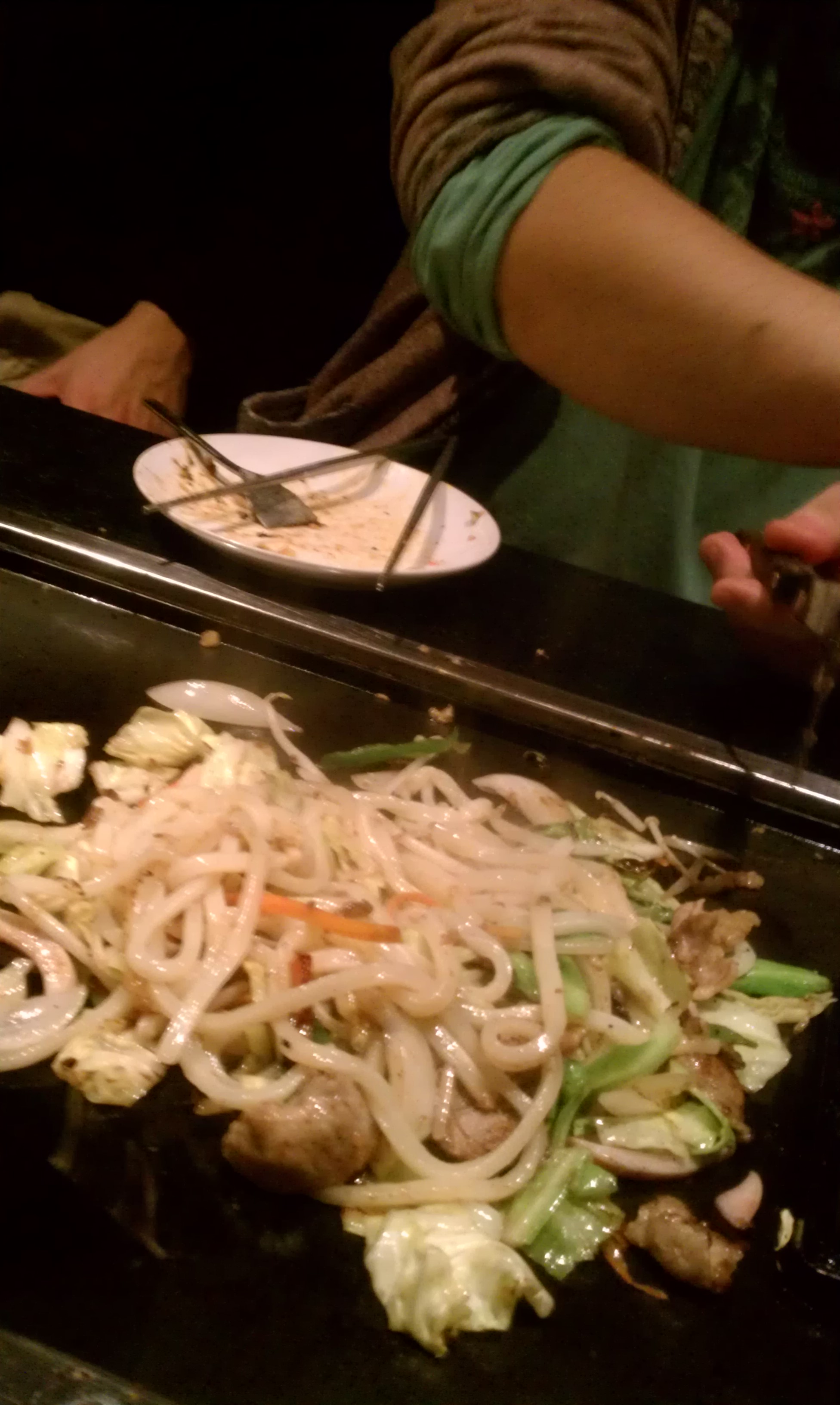 もうだいぶおなかいっぱいですが、うどん会だから焼きうどん。ここにかけるタレが出汁醤油っぽい味で、これまたすすみます。かつぶし振って。じゅー。