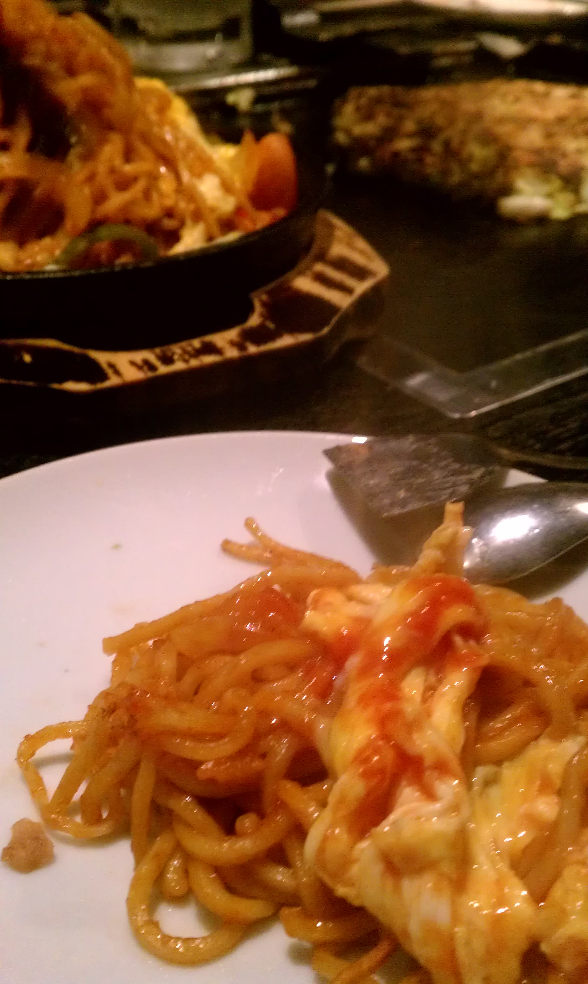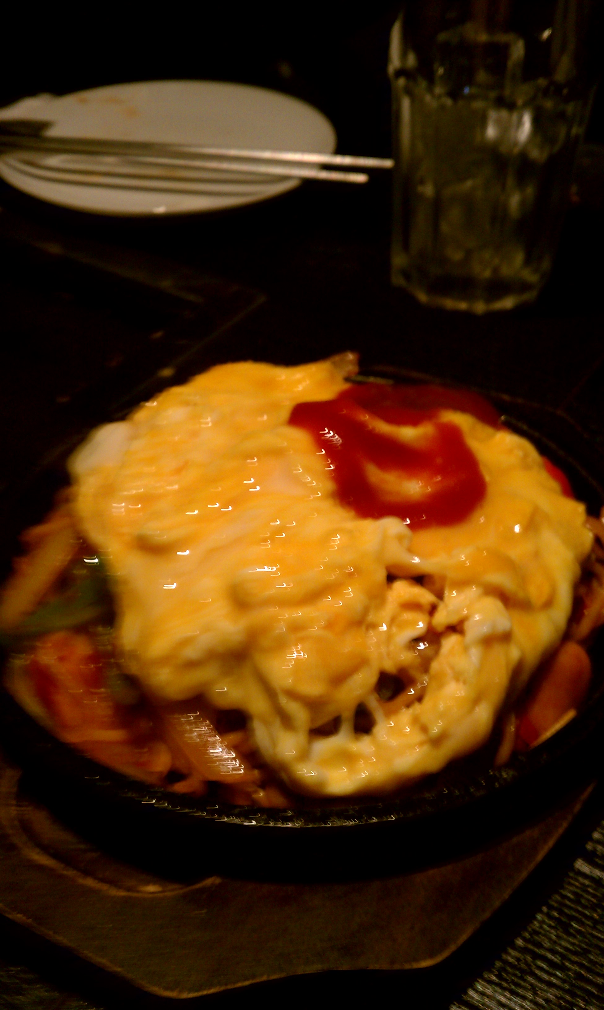 そうこうするうちナポリタンが鉄板に乗って運ばれます。酔っ払ってきたので写真ブレてます。卵のってる!しかも麺はヤキソバ!わっはっは~(謎の高笑い)