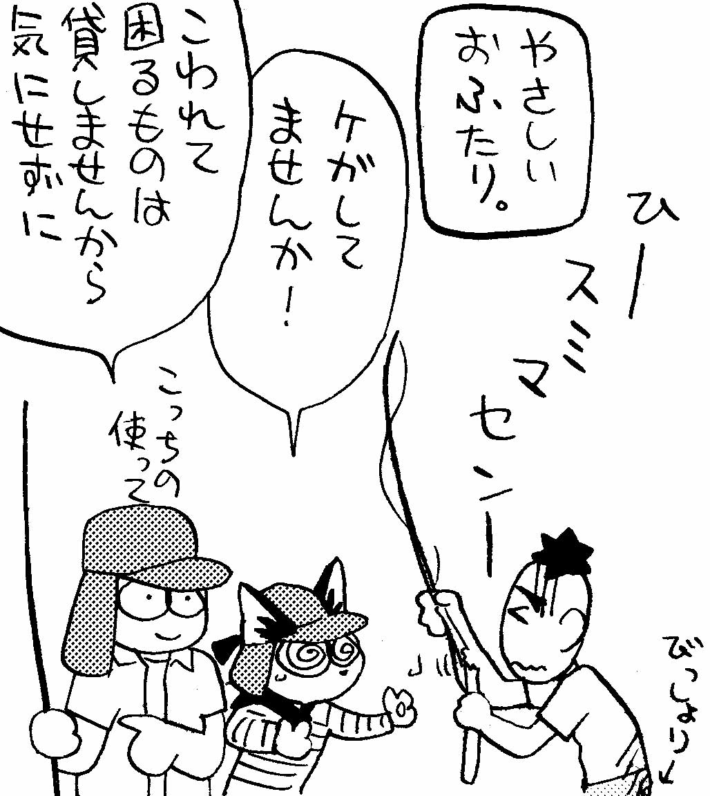 寺島が初めて水玉さんにお会いしたのは20年ほど前のSF大会だったと思います。初対面にもかかわらず旧知のように接していただき、その後も年に一度ガイナックス仮装忘年会でキュートなお姿を拝見するだけなのに、勝手に友達と思っていた寺島は、数年前うどん会で釣りしたい熱が上がった折、水玉さんに千葉での潮干狩りに誘っていただいたことがあるのを思い出して「素人が道具ナシから始められて美味しい釣りないスか?貝以外で」とお気楽な相談をもちかけました。そしたらなんと、親身に検証から下見から道具の用意からしていただいて、江戸川河口でのテナガエビ釣りをプロデュースしていただいたのです。優しい水玉さん夫妻のレクチャーを受け、カンタンな道具で手ごたえのあるこの遊びがあまりにも楽しくて、うどん会メンバーは、実は釣りがニガテだった寺島(じっと待ってるのができない…)を含め、まんまとその夏ずいぶんハマったのでした。