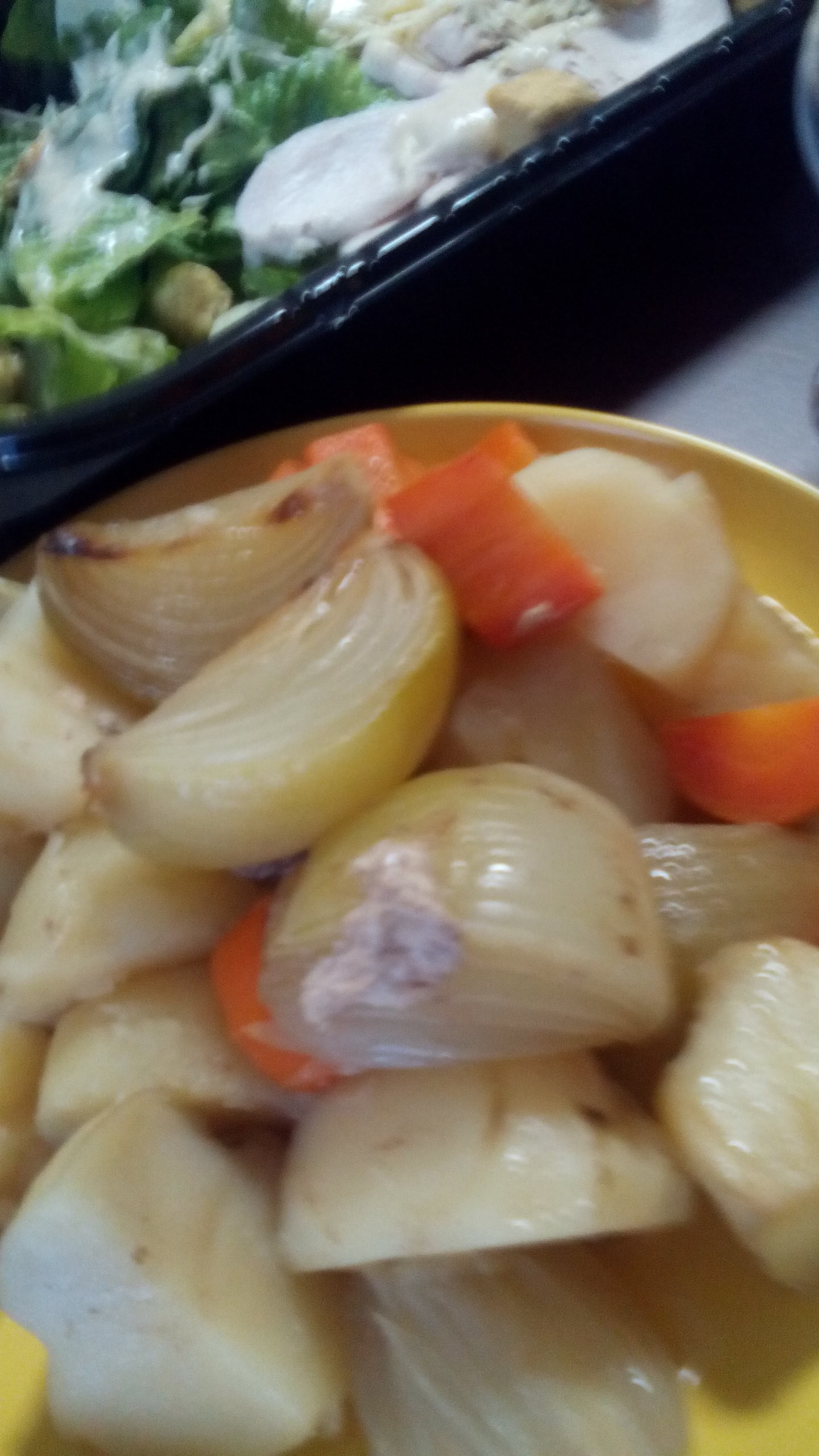 肉汁入りのヨークシャープディング、一緒にオーブンで焼かれたやさいたちを添えて。