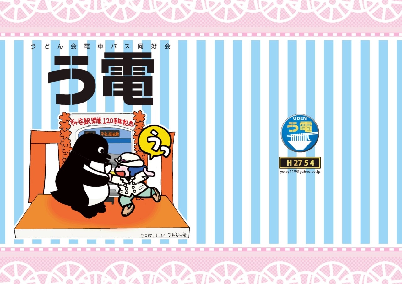 うどん会電車バス同好会 う電。「会」が2回ありますね、とほほ。レース(動輪デザイン♪)やピンクで女子鉄っぽさを出していますが、中身はいつものうどん会メンバーがバスや汽車や自転車や工事や葬式について描いています(電車は!?)。当日のペーパーを拡大してみてくださいね。
