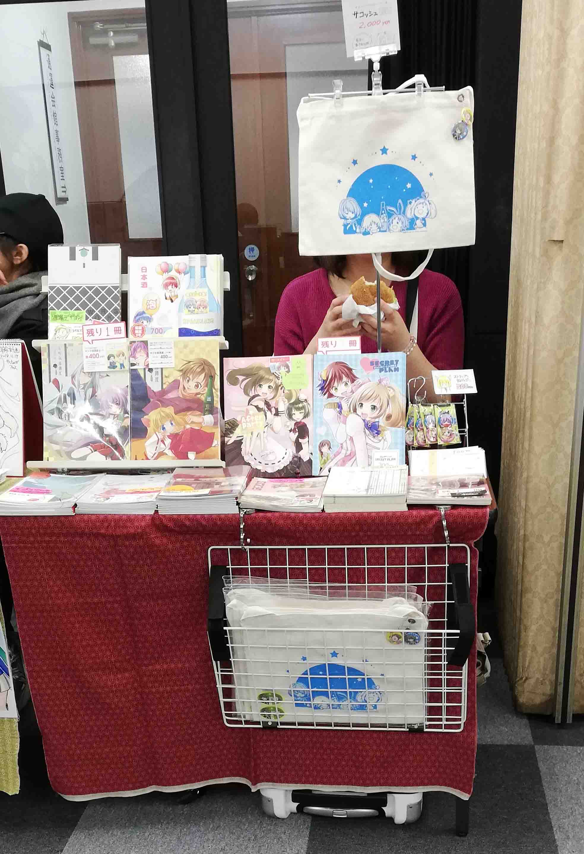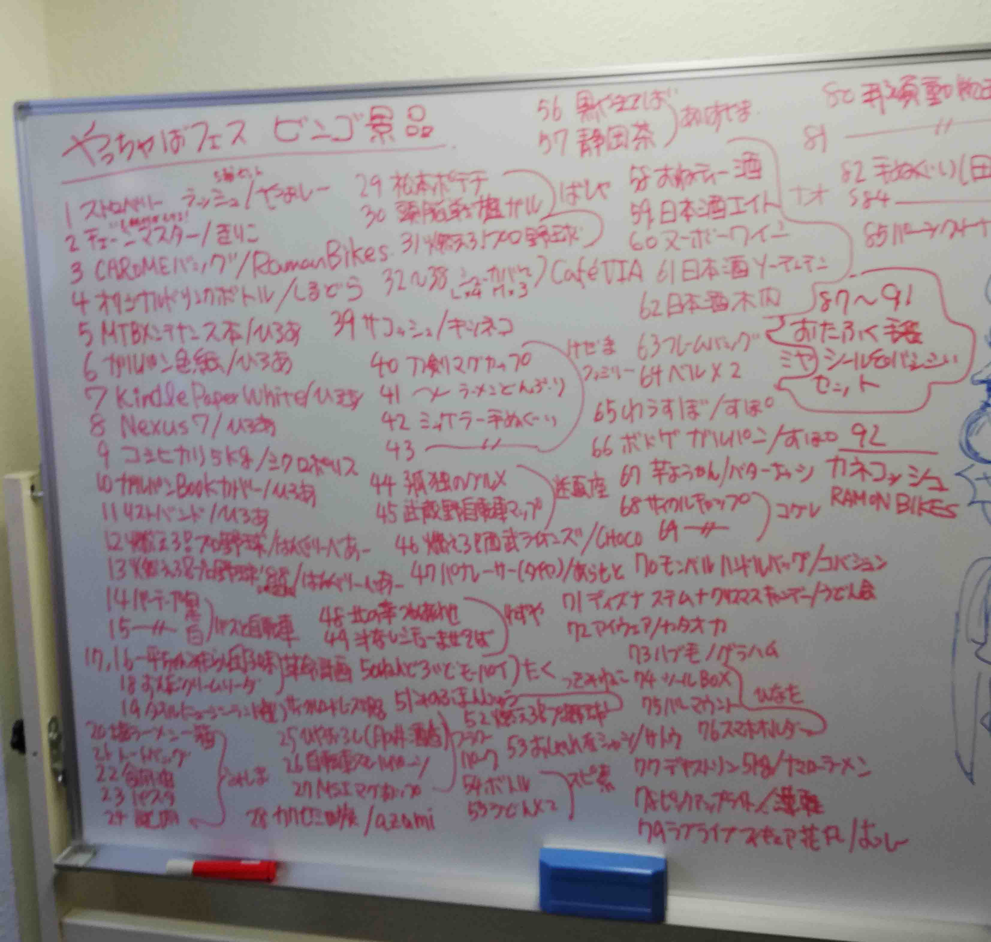 2018/11/21 Category : 同人誌 やっちゃばフェスに出展しました! 11月17日の土曜日は秋葉原通運会館でやっちゃばフェスでした!自転車と飲食のオンリー同人誌即売会ですが、このところ自転車率があがって、去年自転車同人誌「グルコギ」が6で完結しちゃったうどん会は、ちょっと肩身が狭いなーっと思いながら参加です。しかしさすがは行動範囲の広い自転車者、新刊鎌ケ谷本や埼玉系の本を手に取っていただいたり、その他うどん会の活動に興味を持ってもらったり、映画本やブックカバーも見ていただいて満足満足。ストライクゾーンも広いみなさまありがとうございました♪ お昼にはやっちゃばフェス限定バーガーの香りに満たされる会場。パクつくお向かいのささつゆさん。 そして終了後のビンゴの景品にはおなじみのファミコンソフト「燃えろプロ野球」が増殖しており…なぜか「頭脳戦艦ガル」まで登場しています。「そうなんですよ!ひどいでしょ、当時あれクリアできなかったっすよ?」と主宰。うん、そういう問題じゃない気もしますネ。プロテイン5キロとかもある。みんなビンゴを色んな意味で楽しんでいます。ホワイトボードを見るとラクガキする参加者たちも良いネ。 「レッツ」「ビンゴー!」 というわけで、うどん会はいろいろあたりました。ありがとう! ガルパン映画入場特典のミニ色紙は家に帰るとセットになりました♪よかったね、田中。 http://udonkai.blog.shinobi.jp/Entry/147/やっちゃばフェスに出展しました!