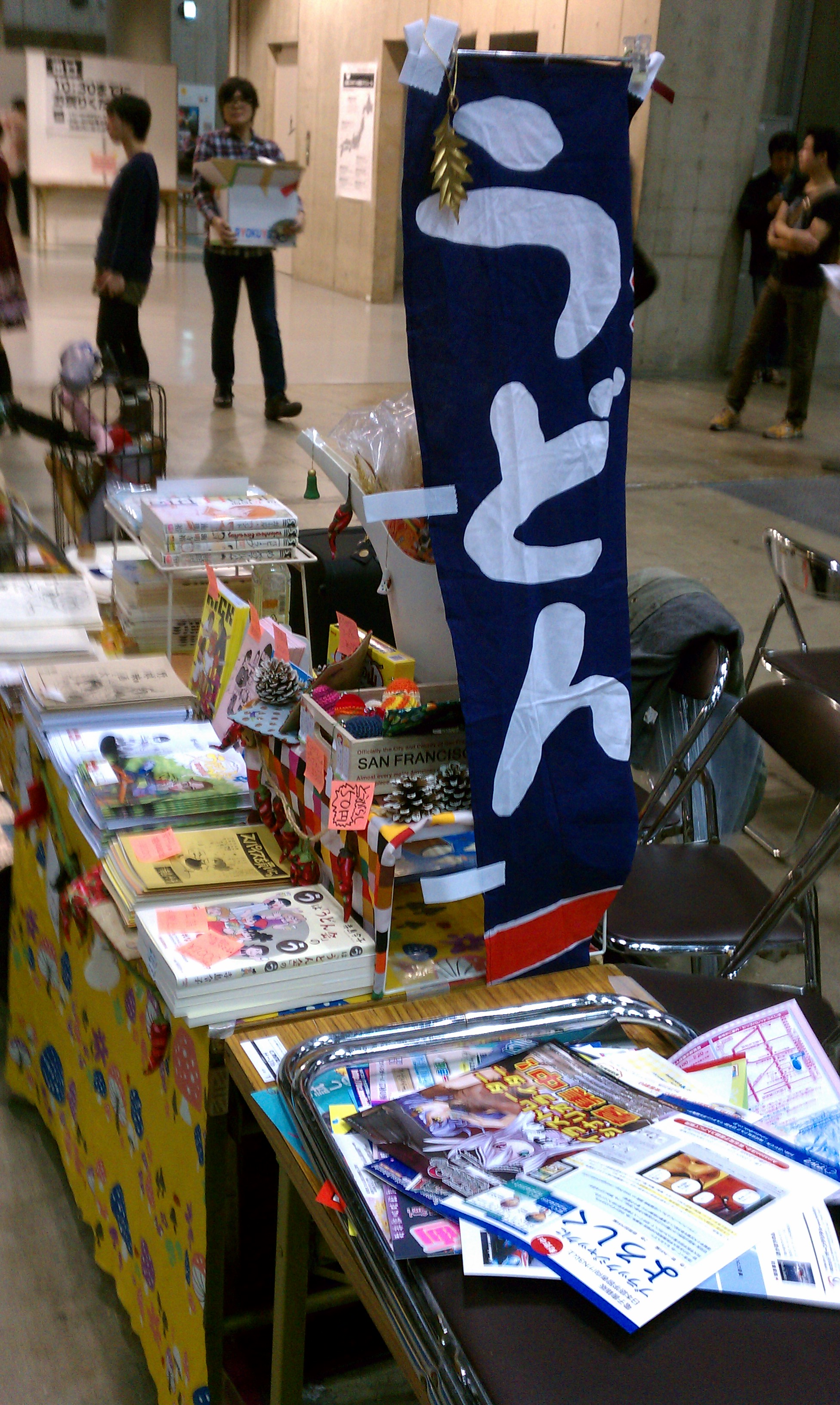 雨音がビッグサイトの屋根をたたきオムソバのソースの香りが流れる中、いつものように自転車&大仏遠足、らっきょう、スパイス、キックボクシング、野球映画と大リーグ、と雑多な小冊子にきのこやトウガラシも並べ、「うどんは?」と聞かれるうどん会。自信満々にのぼり立ててますもんなー。すみません。次回こそうどん本を(と毎回思うのですが)。