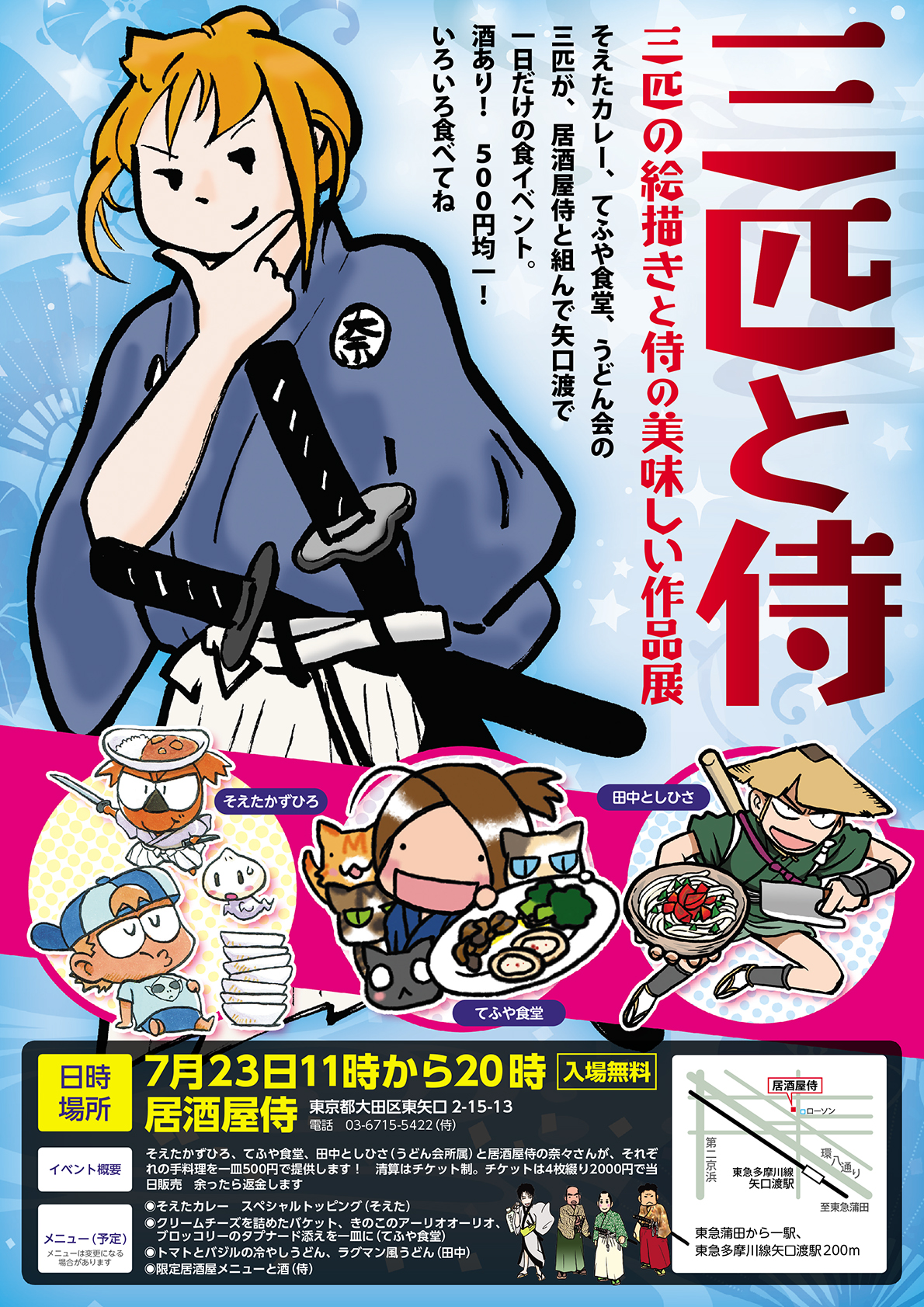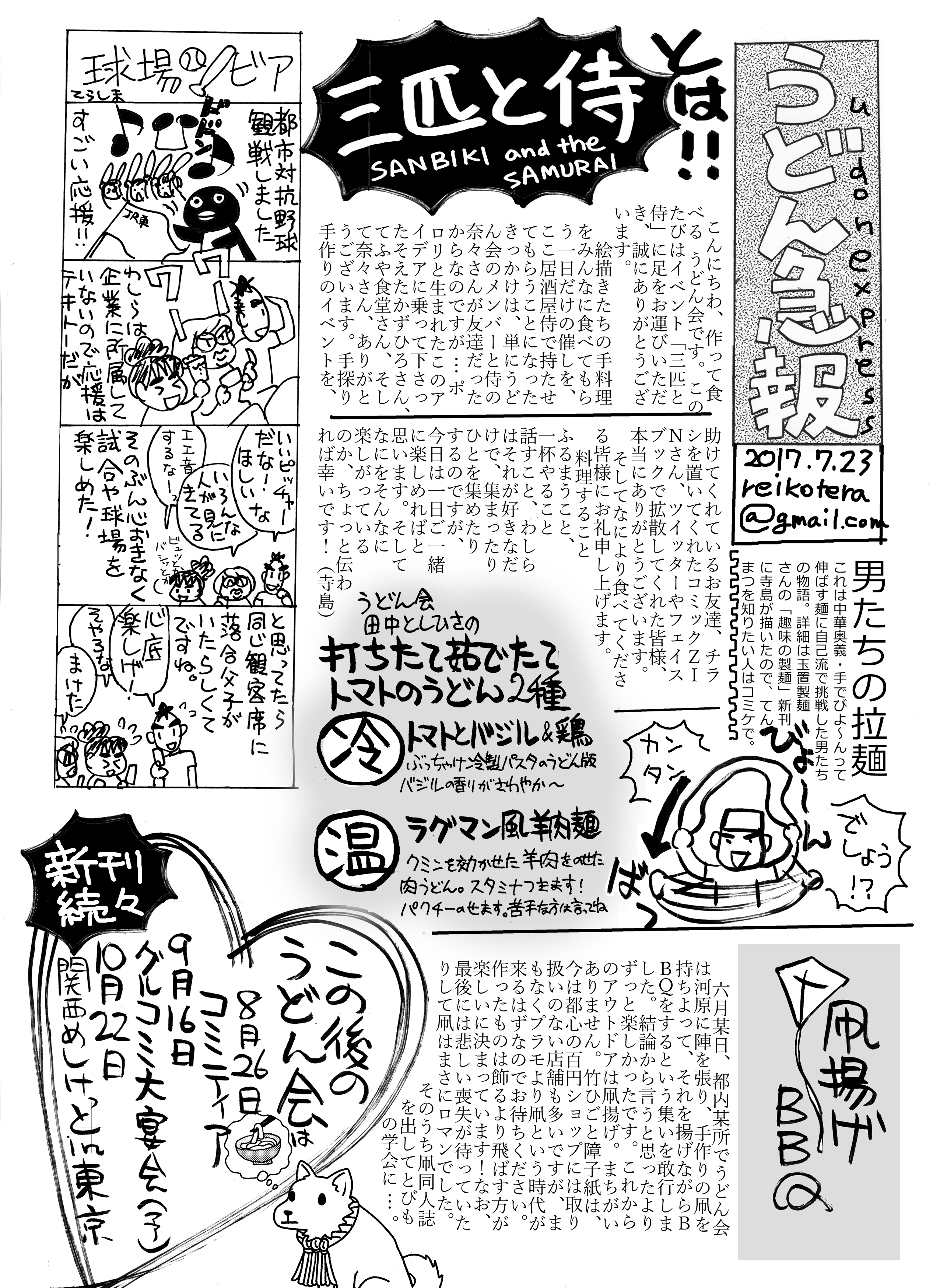 一日じゅう手伝ってくれた肉ちゃん(明日7月27日に新刊が出ますよ!)、ポスターのデザインもさせたし働かせもしたわがうどん会会長はじめ、会のみんなも、ありがとう!ありがとう!やってみて、ムチャはムチャだったんだけど、わしはホントに楽しかったです。場所を提供してくださった居酒屋侍さま、ありがとうございました。そして、4年前第二回の開催から「調理アリ」になったあたまのおかしいコンセプトの食べ物系同人誌即売会グルメコミックコンベンションがなければシロウトがこんなイベントをやろうとも思わなかったはずですので、ここにあらためてお礼を申しあげます。グルコミ店長、ありがとうね!会社にチラシ送り付けたらホントに来てくれたけど、ぜんぜん奢らなくてゴメンネー!!!では皆様9月のグルコミ大宴会でお会いしましょう(その前にコミティアでうどんのちょっといい本だすのだガンバル)
