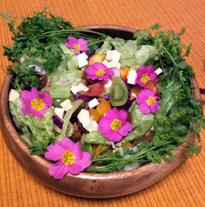 ファンタジー系:生ハムの花サラダ(生ハム原木をそいだもの&食えるフラワー+オリーブ+季節の野菜をてきとーに)