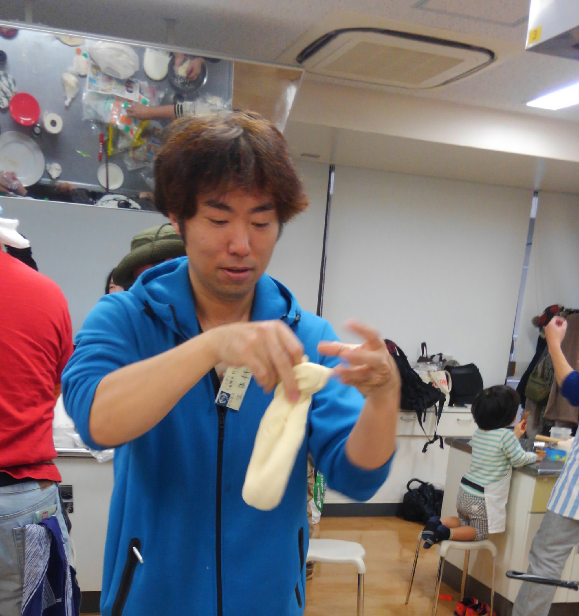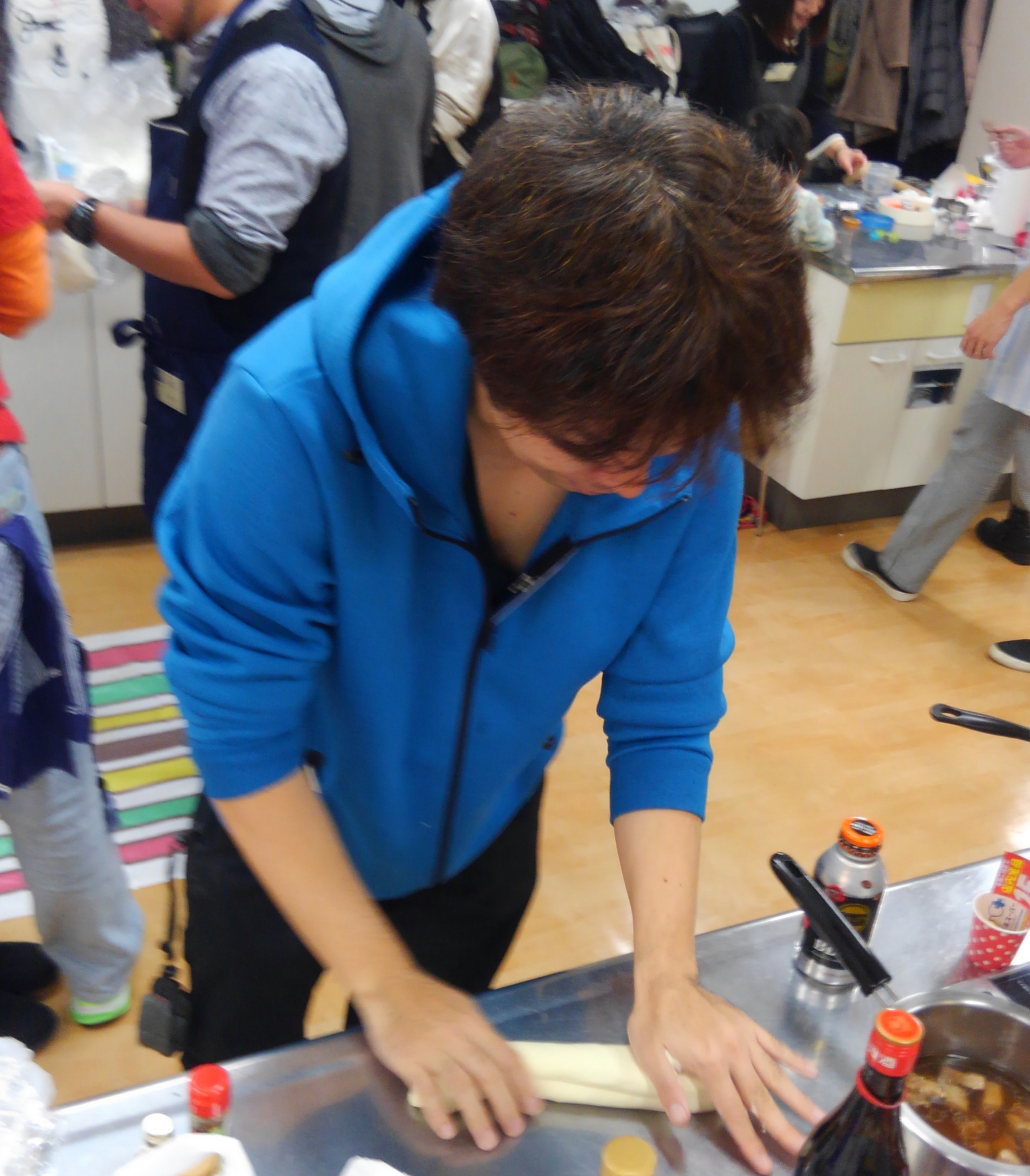 踏んだら寝かして(すぐには食べられません)、その間に近所のビール工房にいっぱいやりにいったり隣の会議室で同人誌を読んだり、他の人の作ったものを試食したりしてもらってと。そしておもむろに伸ばして切ります