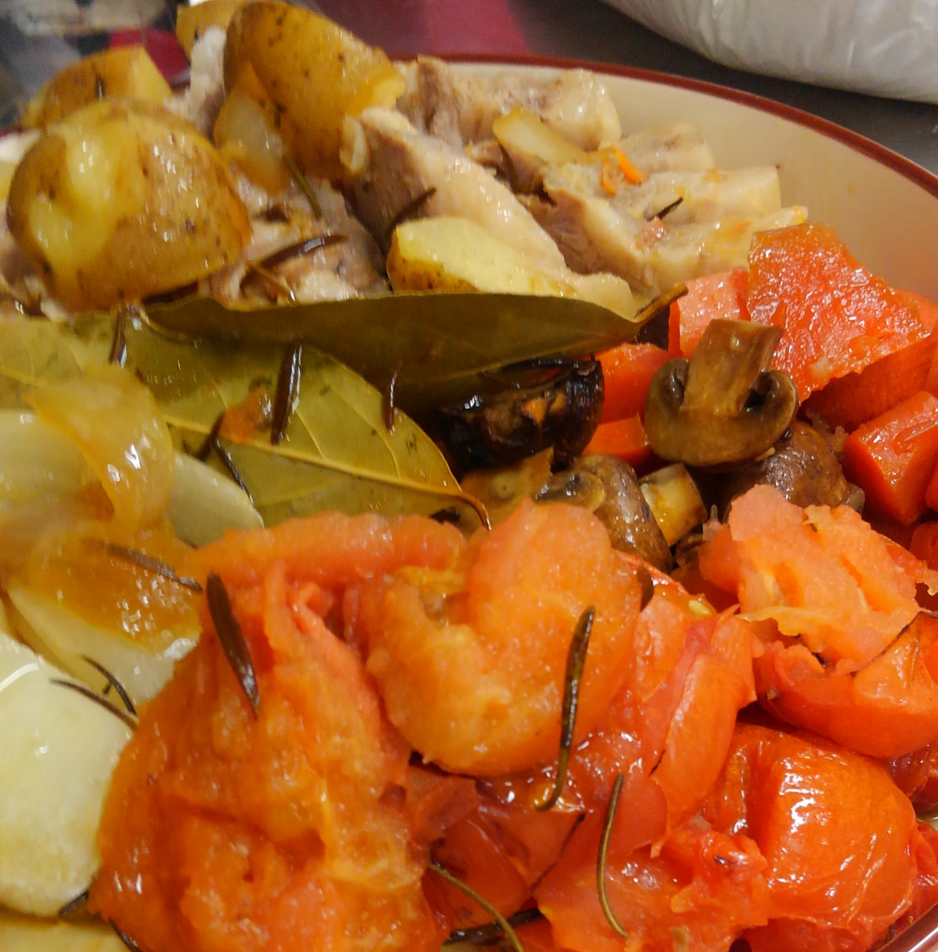 焼き目をつけて鍋ごとオーブンにつっこむだけ!カンタンだけど、大皿なので大勢で食べるときにしか作れない冬のごちそう料理です。崩れたトマトとマスタードをつけて、食べて食べてー!