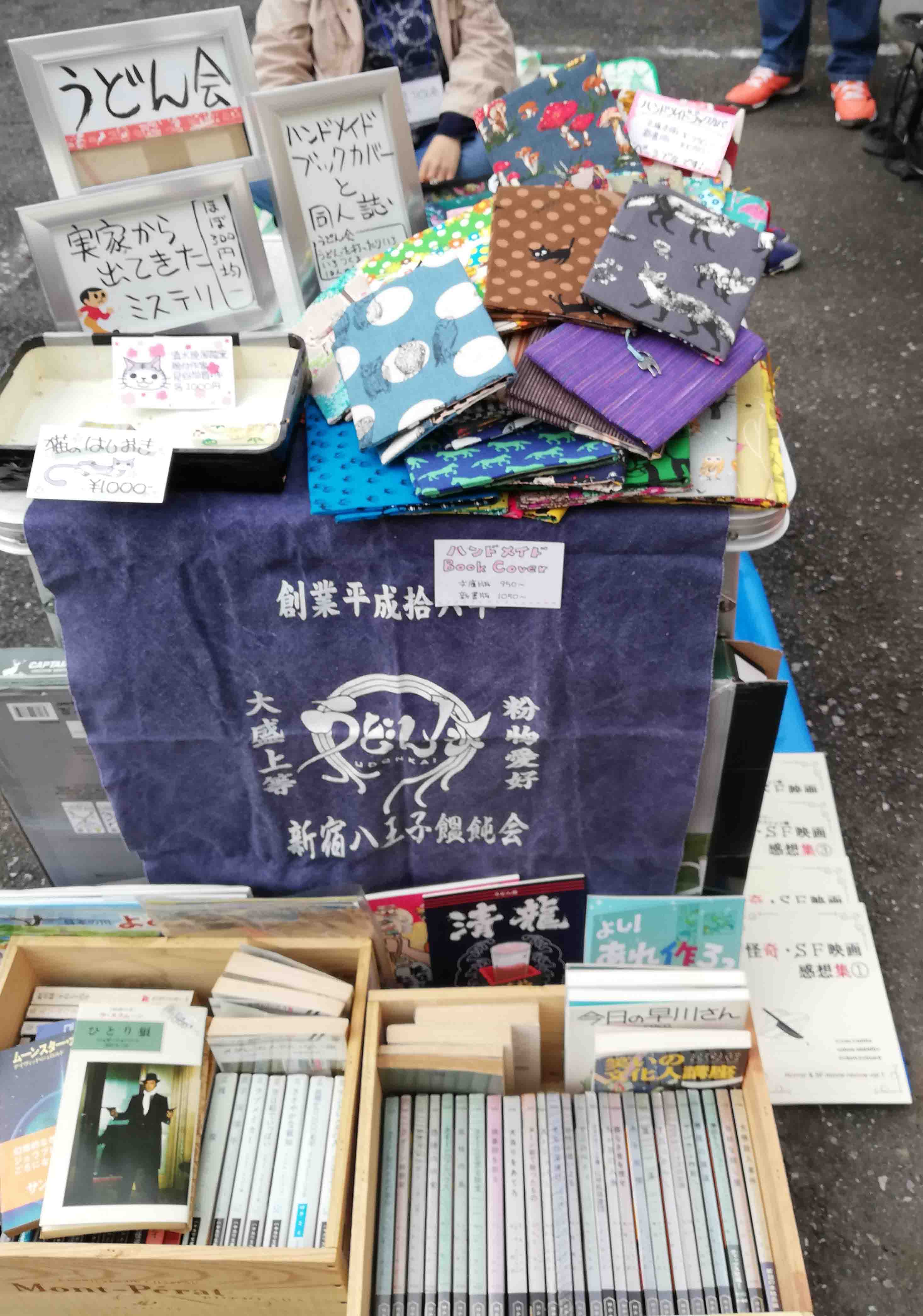 あとはいつものうどん会です。同人誌とリバーシブルブックカバー、てらかわの友人の清水焼絵付師の箸置きもあります。そして開店と同時にに売れていくりょうこちゃんの映画本。