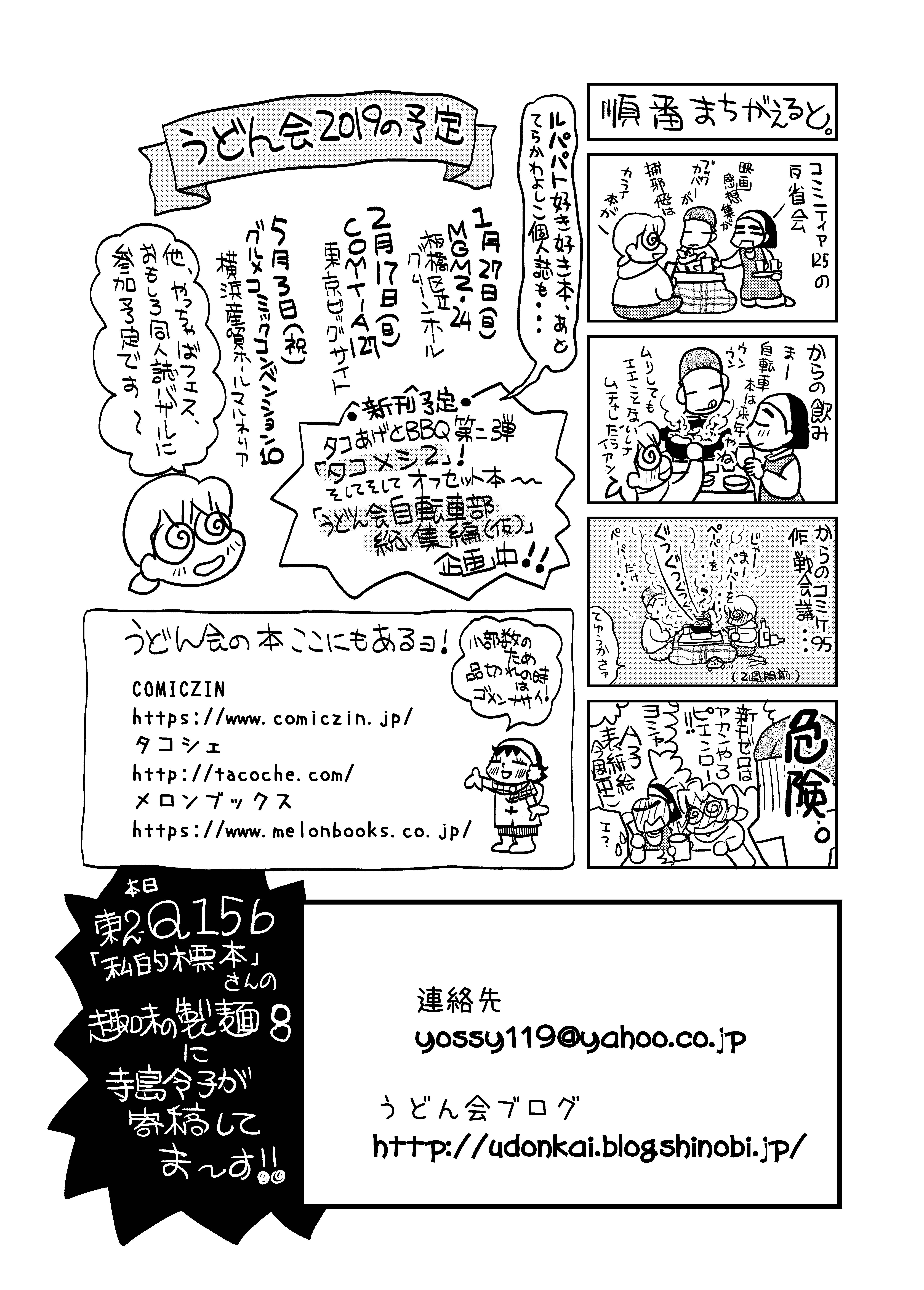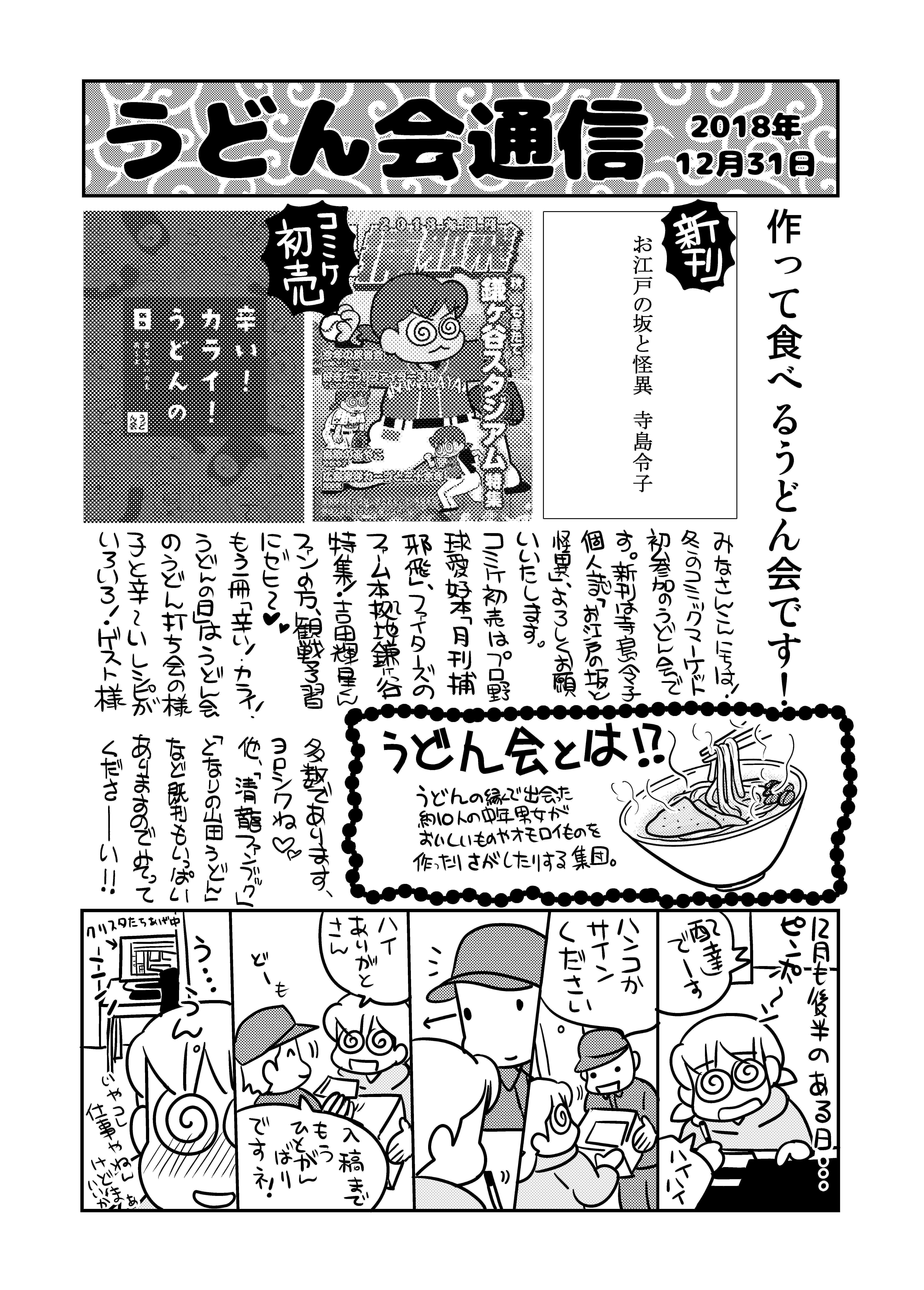 ところで「サークル参加(者)」と言えばコミケの「一般参加(者)」に対して本を頒布するブースを出すこと(ひと)を指す言葉ですが、実際はほとんどのサークルの主体は「個人」のようです。うどん会は今どき珍しい複数人の「サークル」なので、そのことをアピールしてみました!本当に趣味で集まったサークルの漫画描きやデザイナーが手を動かして薄い本を作り、ゲストにも原稿をねだって、とくに頼まれてもいないのに世の中に活動報告をしているのです!す、すんません。いや謝ることはないなw