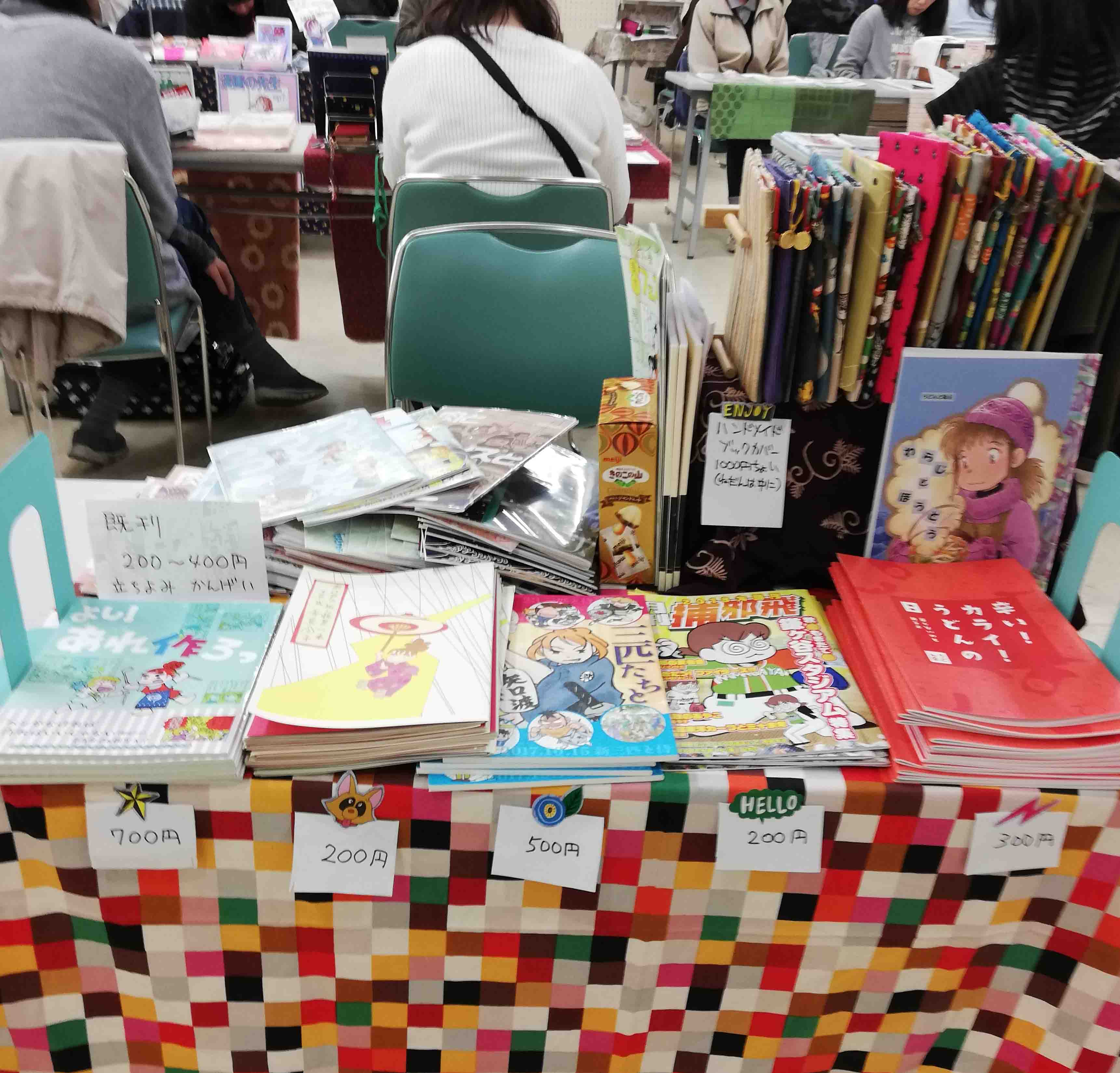 この日はてらかわも田中ものっぴきならない仕事で欠席のため、うどん会は寺島ひとり参加です。はー!急なことでつり銭の用意がない!別ブースで出展の小杉あやちゃんとながたさんヘルプ!はー!掛け軸のようなものを展示したいが背が低い!いわみゆうこ先生ヘルプ!そして出展のTwitter広報はささつゆさんありがとう!などと、出展者同士が顔なじみの小さな即売会は、ひとりでも我が家のような安心感(ちゃんと用意しろ)。