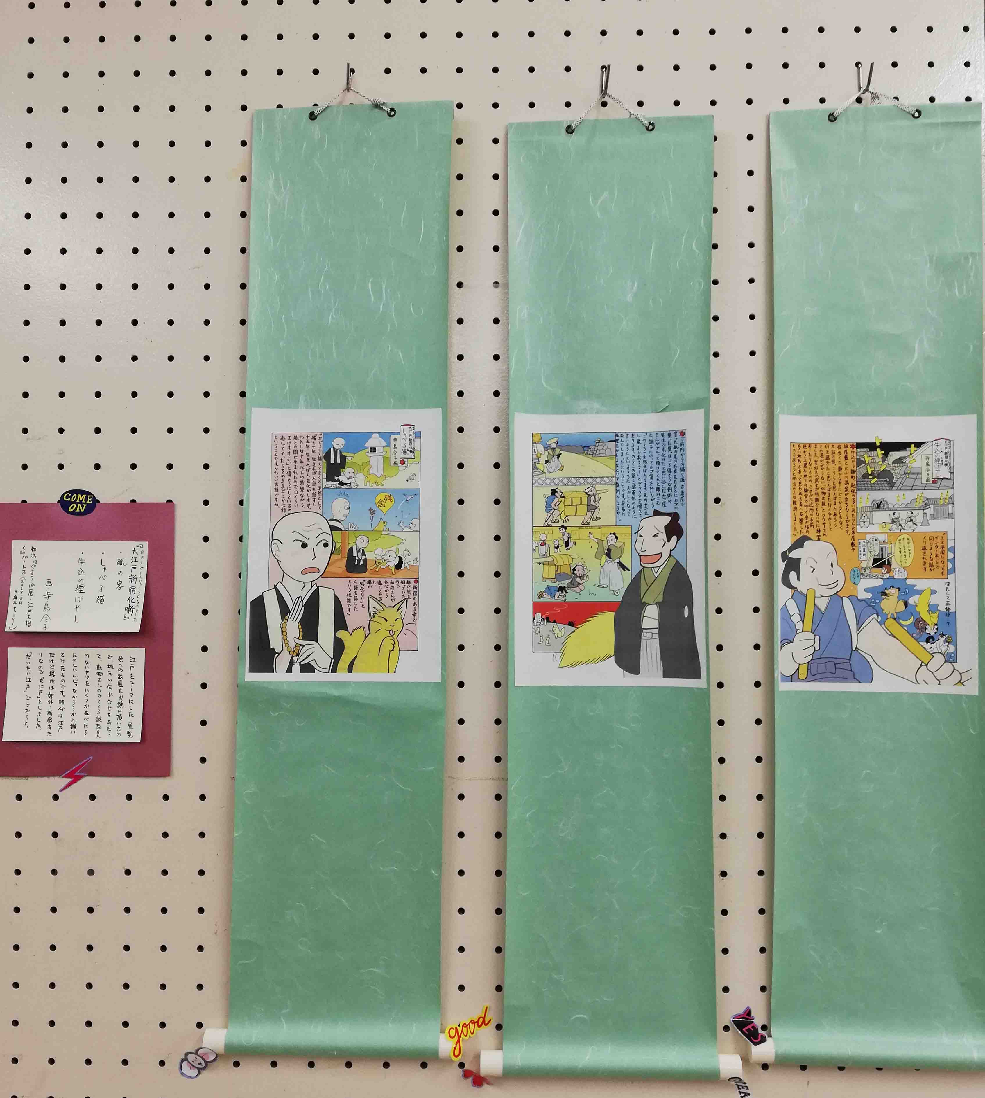 MGMはまんがギャラリーマーケットの略なので、申請して壁に絵を展示することができます。けっこう見てもらえてたのしい。今回寺島は昨年の夏に参加した「お江戸を描く」展の出展作を展示。新刊もその記録だったのでした。展示はプリントアウトを軽い簡易版の掛け軸に付けたものですが、これが前を歩くだけで人のおこす風で揺れるのなんのって!よく掛け軸の下のはじっこについてる「風鎮」ってアレ飾りじゃなかったんですねー。重り。そんなものは用意してないのでノリの弱いシールでなんとかしのぎます。