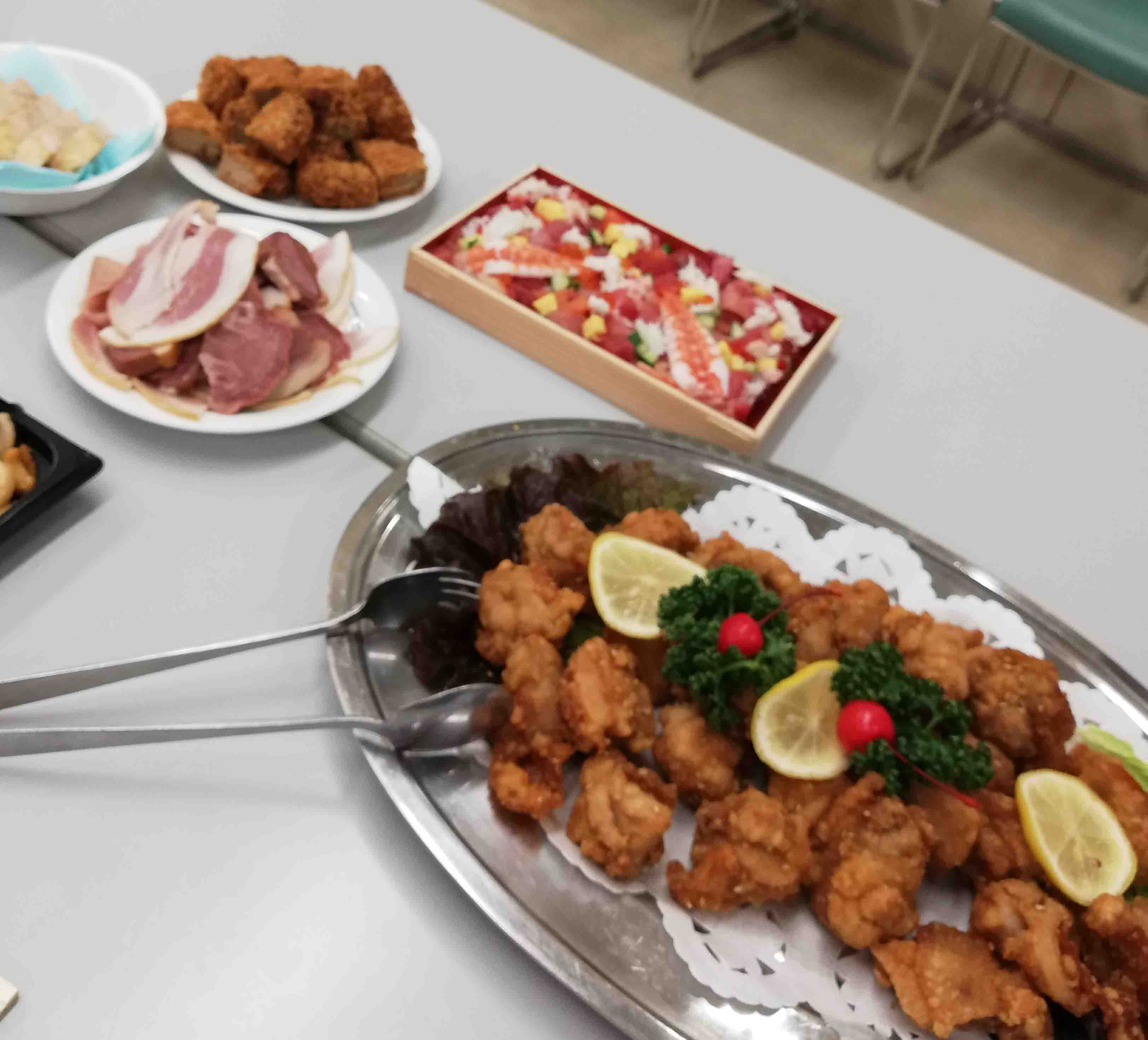 お茶会もおわると懇親会です。写真に写っていない中華や握りずしもあるよ!あるのよ!
