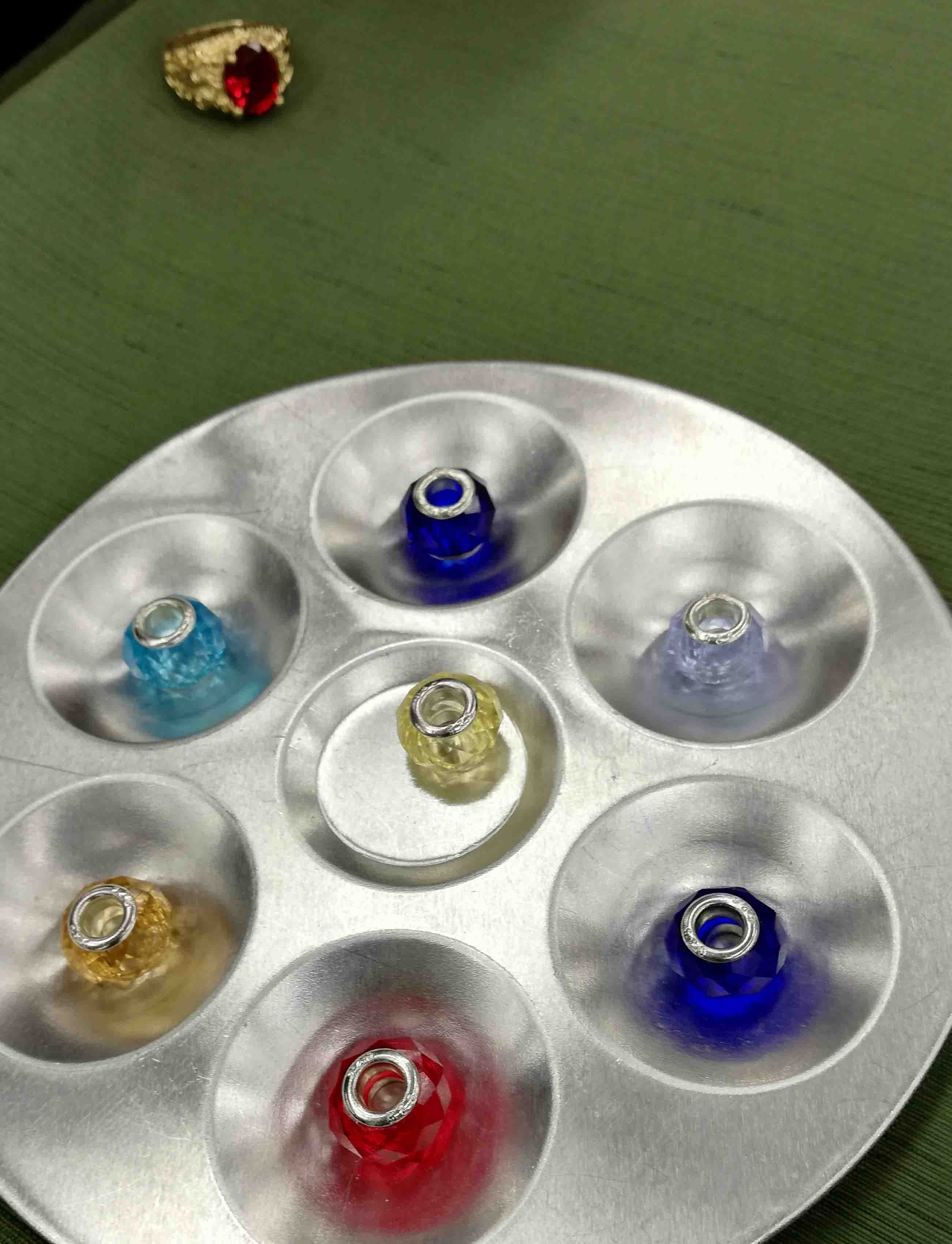 スタートプレイヤーになったわし、袋からランダムにとりだしたビーズを輪に通し、閉じて回して…ろんでる!天和、イッパツで3色の線対称ができてアガリです。わーい!