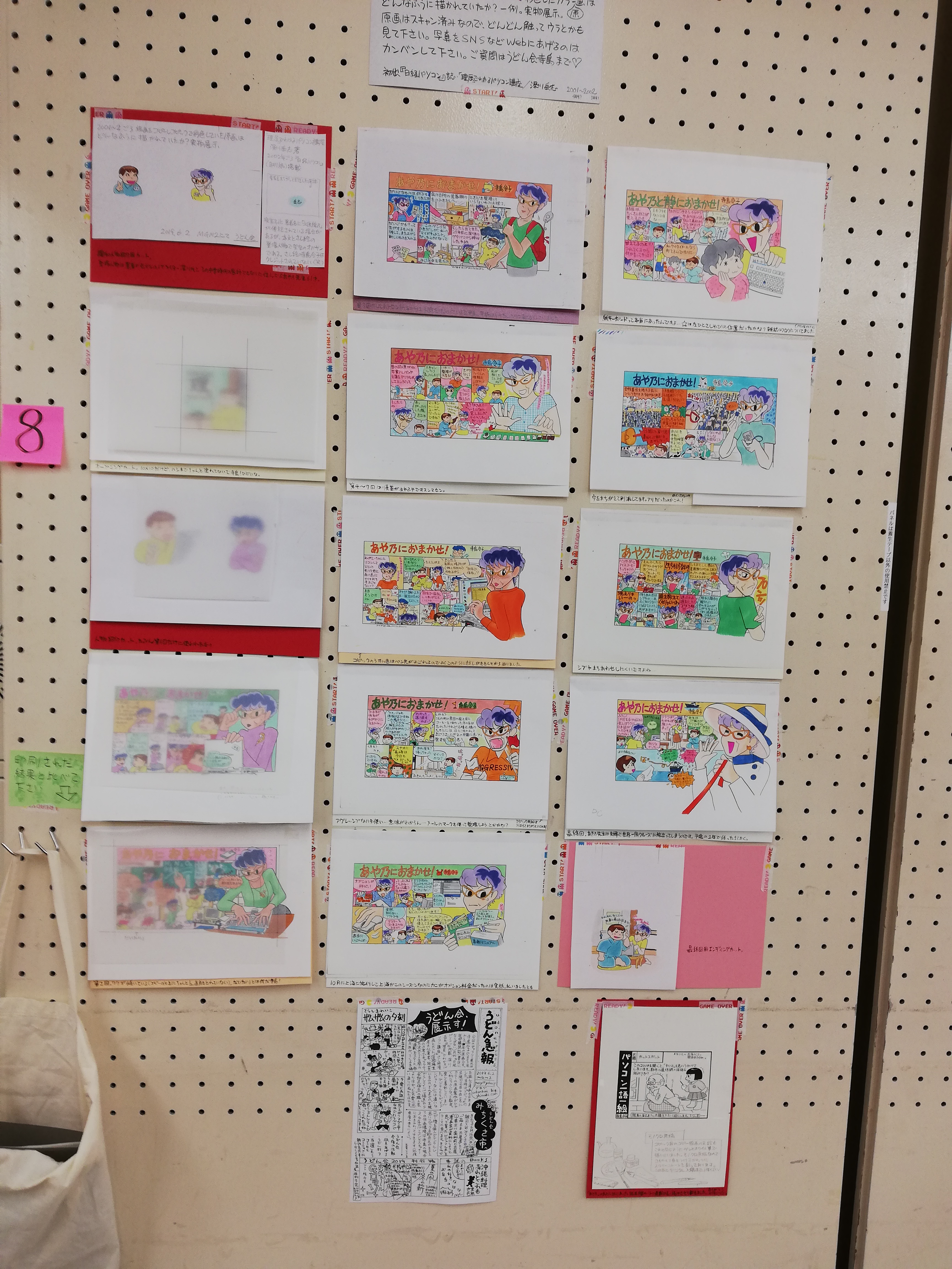 今回のギャラリー展示は寺島の2002年のカラー原画です。コピック使用で主線そのままらくらくフルカラー、色を使うのが楽しかった記憶がありますよ。当時のキリヌキファイルも出てきたので印刷結果と見比べてもらいましょう。み、緑全然出てないよね!!!などと。