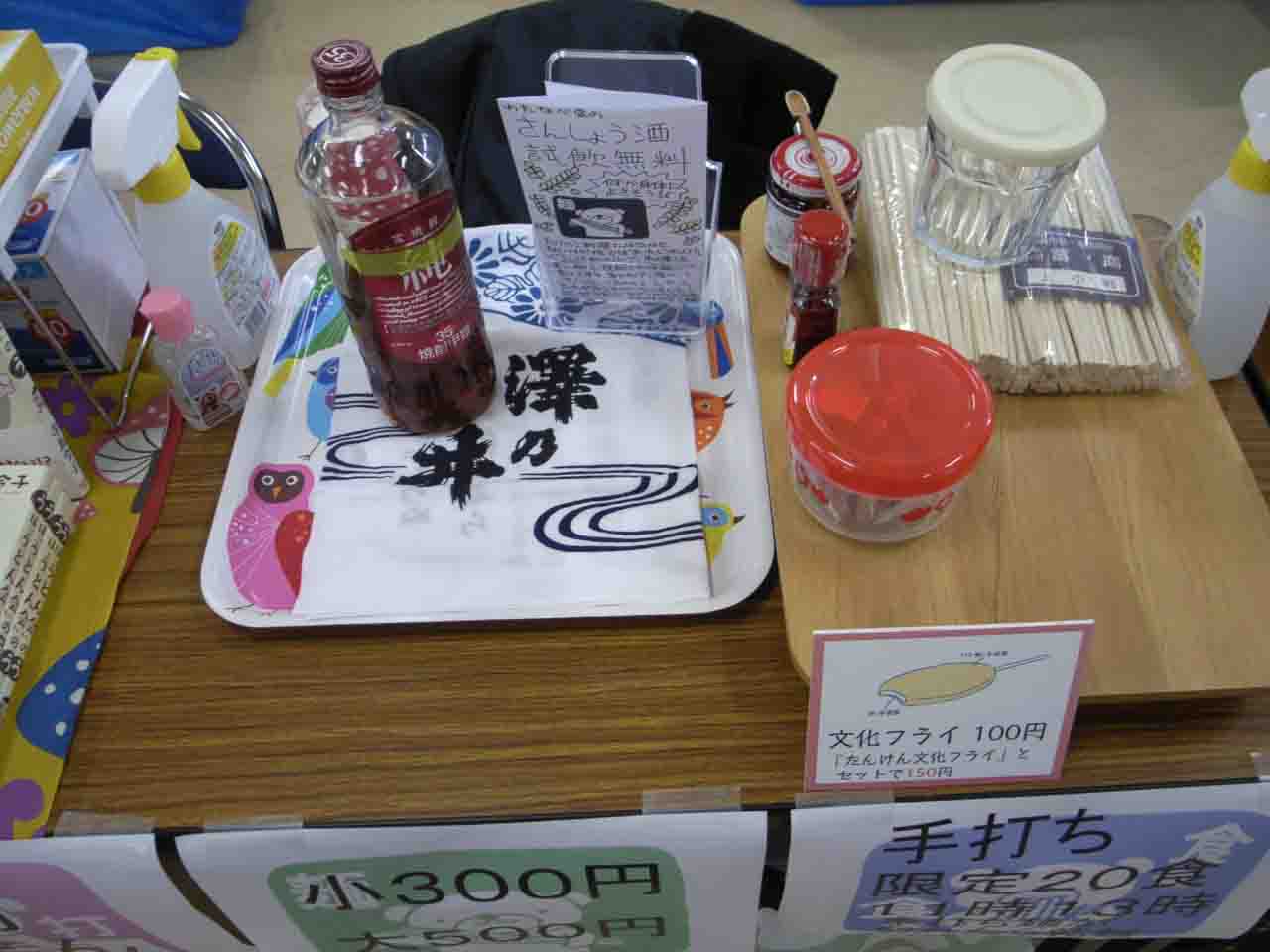 右半分はうどんとフライを売る準備。お酒の試飲もあります。なんとこの会場は飲酒可能でもあるのです。みんな飲んでみたい?あんまりないでしょ葉山椒を山ほどつけこんだお酒なんて。と、いうふうに、いろんなことをしたためブース前はこのあとパニック状態に。