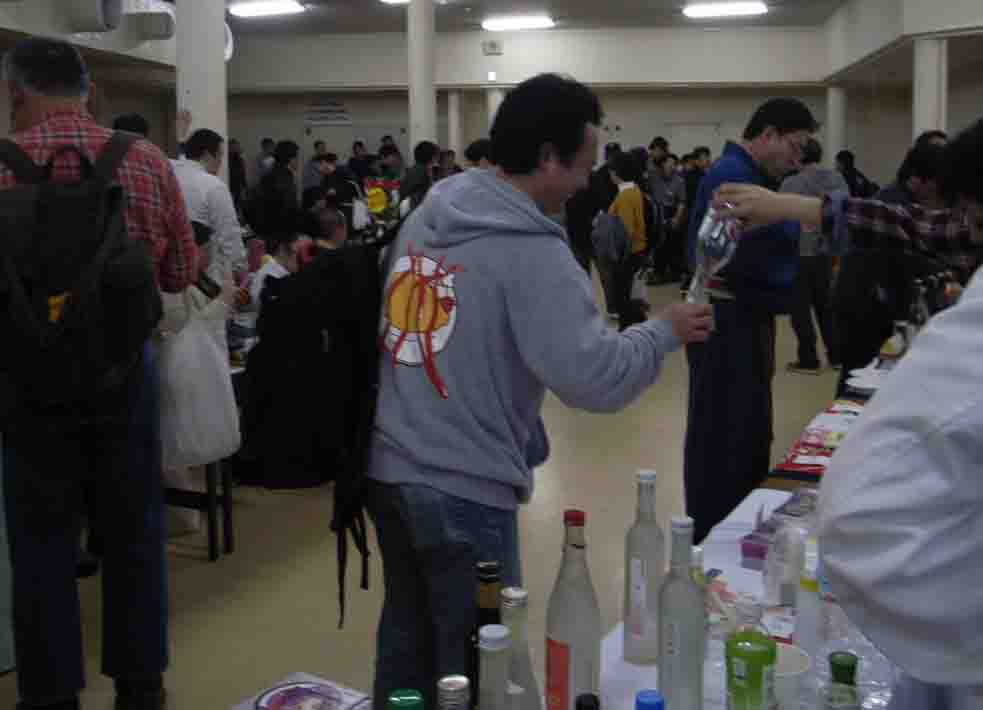 飲酒可能ということにグルコミはこだわっておられます。これは巨大な宴会なのです。本部テーブルには恒例の振る舞い酒が並び、入場者は年齢認証をうけたしるしのリストバンドがあれば誰でもいただけます。つまり800円で飲み放題、あわわ。