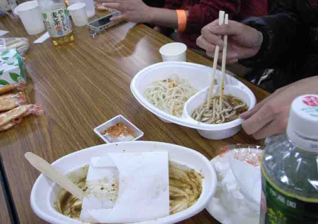 飲食テーブルでパチリ。消防うどんおいしいですか?(消防士さんのまかないうどん 鯖缶しょうが味 写真は乾麺で作ったもの。限定20食の手打ち麺は幻と呼ばれてしまいました 販売の手際がまずくてご迷惑をおかけしました><)