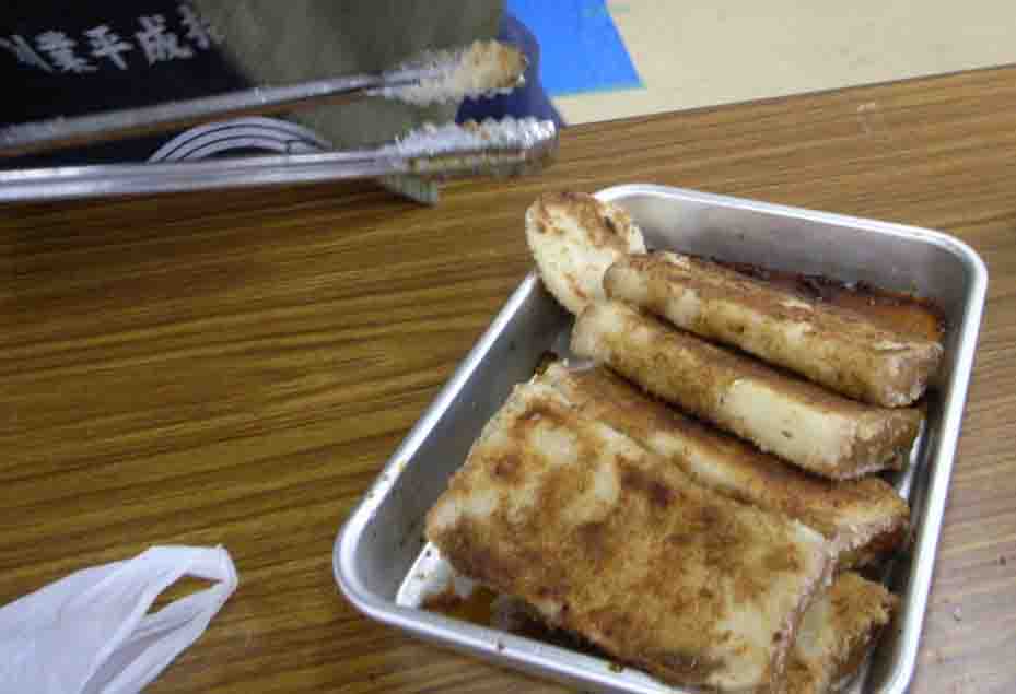 写真がこんなんしかない!つぎつぎ揚げる文化フライ(奥。東京のごく一部の下町の駄菓子、小麦粉とパン粉とソースでできています 味の再現度は下町っこの折り紙つき)
