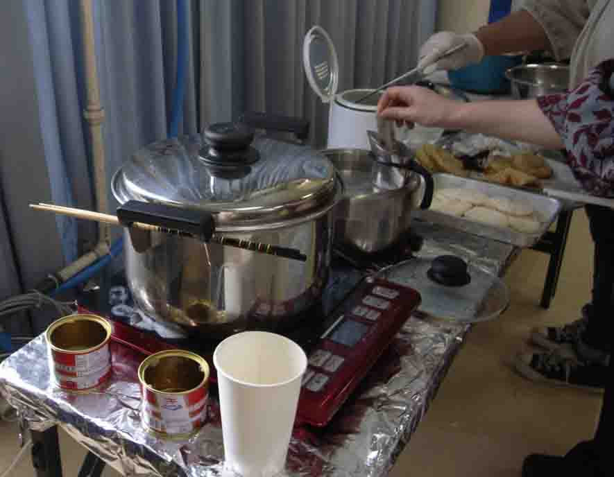 こちらではつけ汁を作っています。後ろの踊る調理人はおとなりのサークル⑨企画の酋長さん。終始楽しそうでした。ありがとう店長(主催者は当日そう呼ばれていました)!すごいよ!でもウォッカの一気飲みはやめたほうがいいよ!