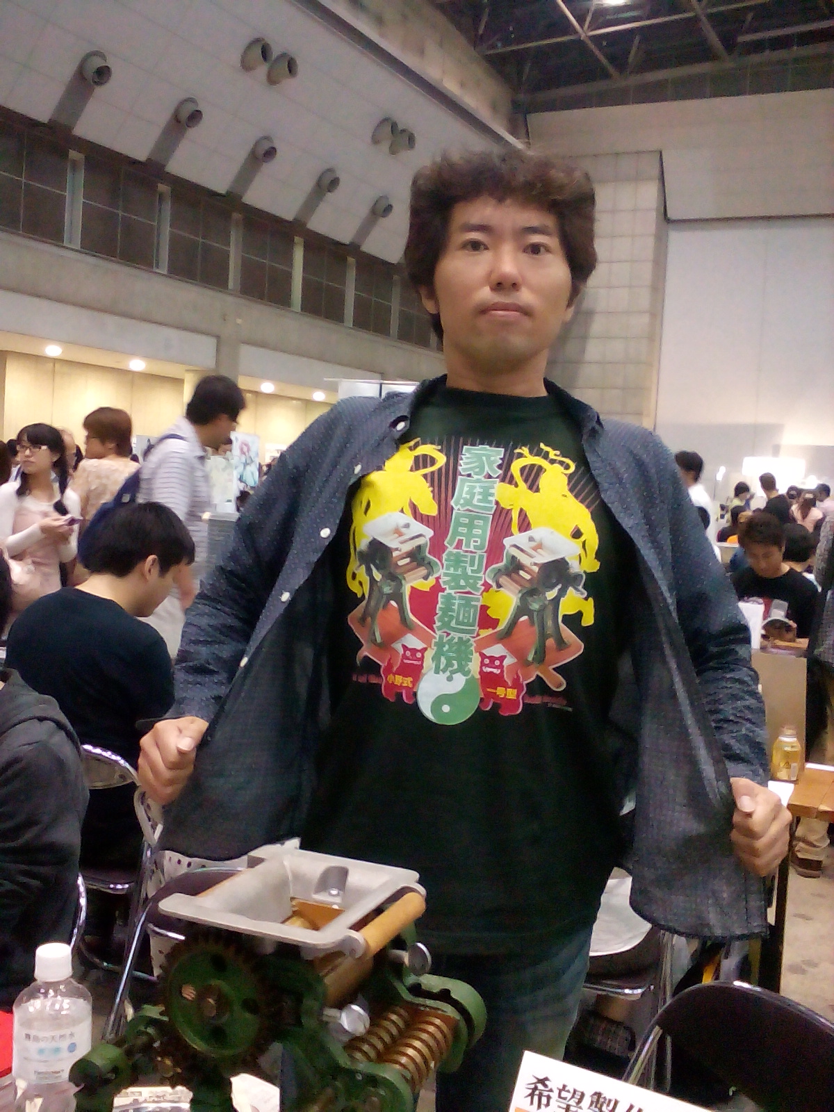 ナナメ前方では製麺機の実演が人気を集めていました。Tシャツをみせびらかす男。いいなあ!