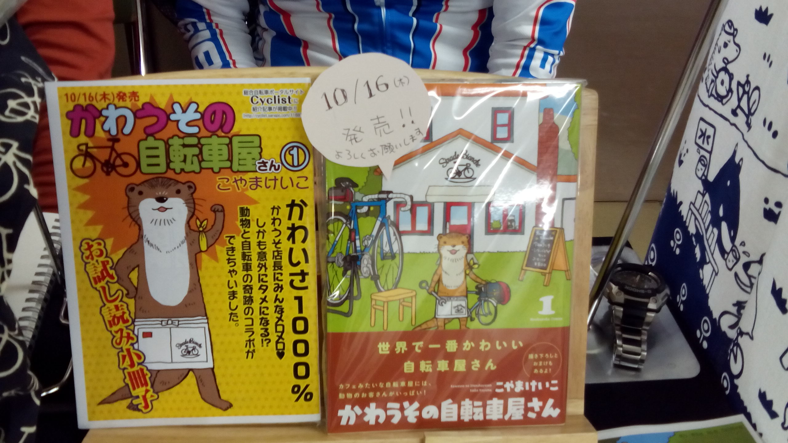 おとなりは16日にかわうその自転車屋さん1の単行本発売を控えたこやまけいこさんのこぐま工房さんです。発売前なのが惜しい~ だんなさまに3Dモデリングされた自転車(の一部)と五島ジャージも。