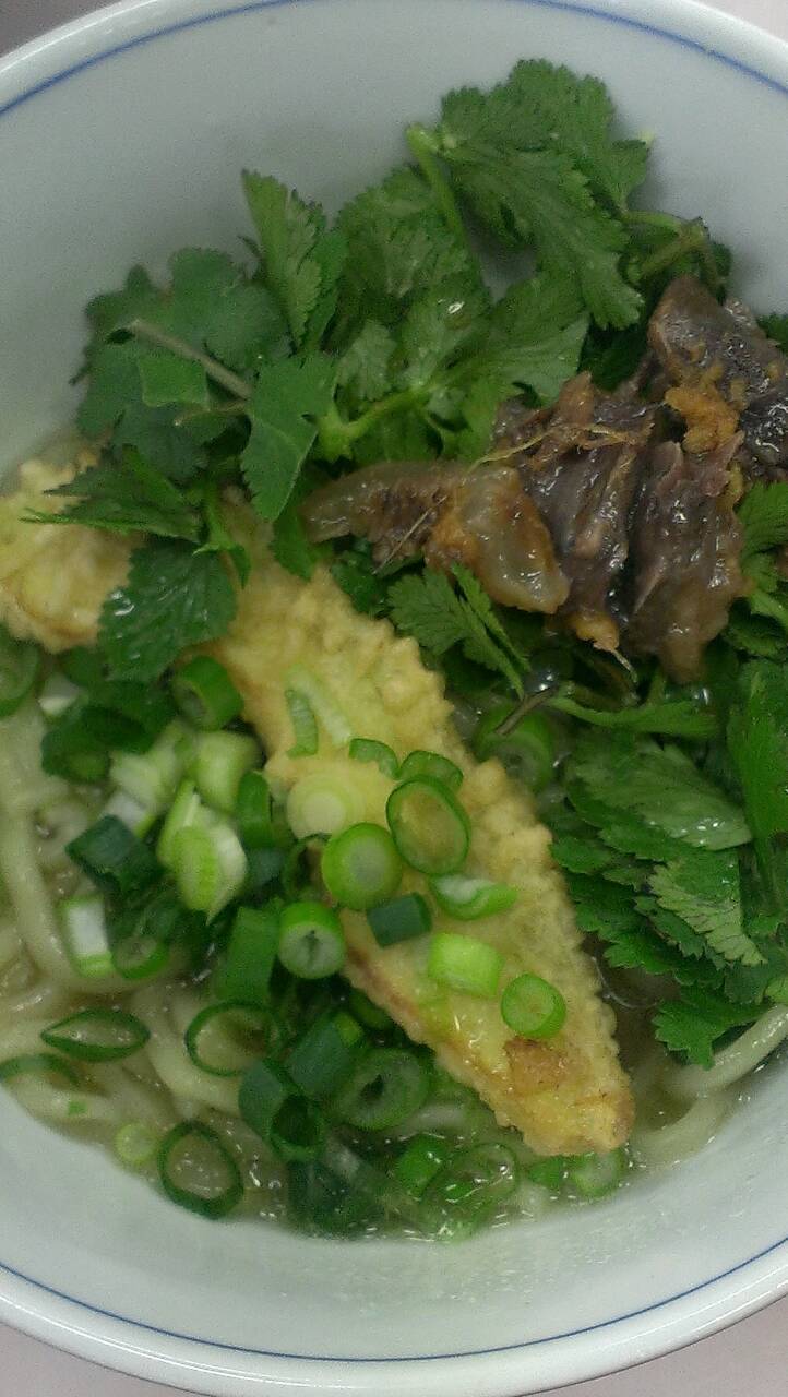 それから「ハワイみやげの塩を使って麺打ってみたいんです」会長のハワイアンラーメンwith牛テール&アボカド天meetsパクチー。黒いのは炭塩ですが、麺が緑色になったのにはビックリでした。あれかな、アルカリとかなんとかほら(研究不足)。ピンクの天然塩はわりと普通(笑)