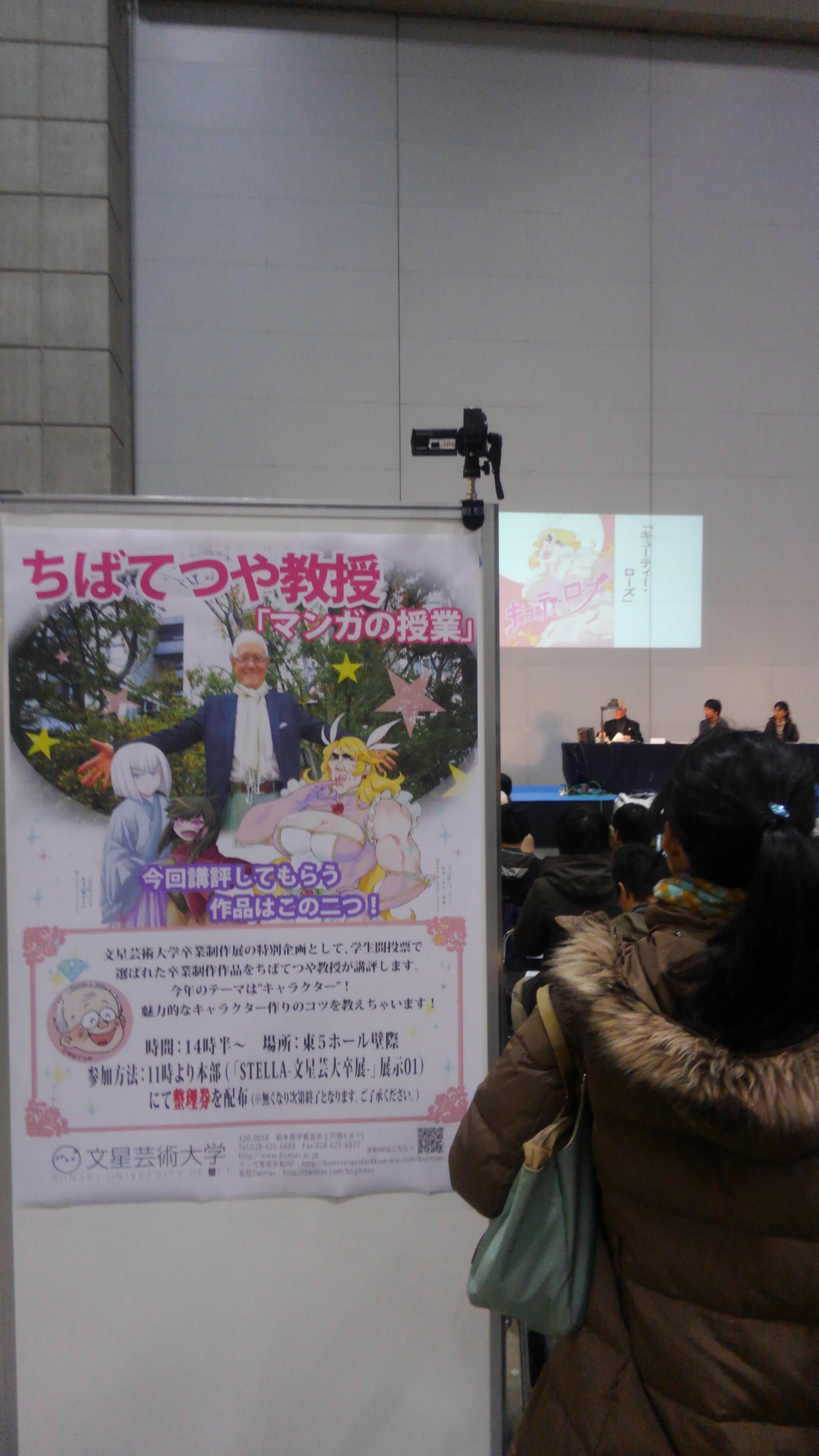 写真が遠いですね。読者に愛されるキャラクターを作るとは何か、ちば先生の実践的な講義をさわりだけ伺って(すみません…)ブースに戻ろうとするとそこには!